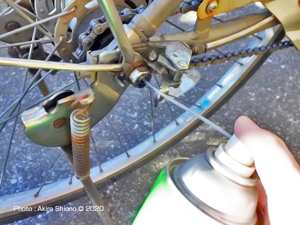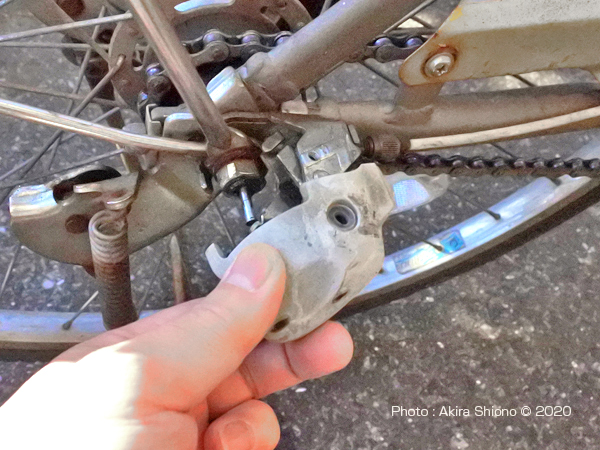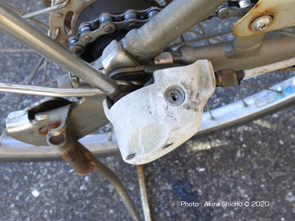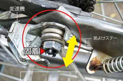 症状は、簡単に説明するとこんな状況です。 別の原因で変速不良を起こしたケース ある日、変速すると下のギアに急に戻ったりしたことがありました。比較的最近プッシュロッドのメンテナンスをしたばかりだったので妙な感じがしました。何故だろうと後輪周りを調べてみると、なんと後輪をフレームに固定している変速機が付いている15mmのナットが緩んでいました。これは多少の締め付け不足もありますが、ママチャリの後ろ荷台に大きく重いものを入れて使用していたからでした。緩みを促進した原因は、荷台の取り付け箇所が後軸に固定されているので、ペダルを漕ぐ時に荷台ステーが左右に振られたのが原因と思われます。重い荷物を後ろに乗せて走る方は、変速異常を起こした時には後軸の緩みもチェックしてください。 変速機本体のグリスアップ トップへ