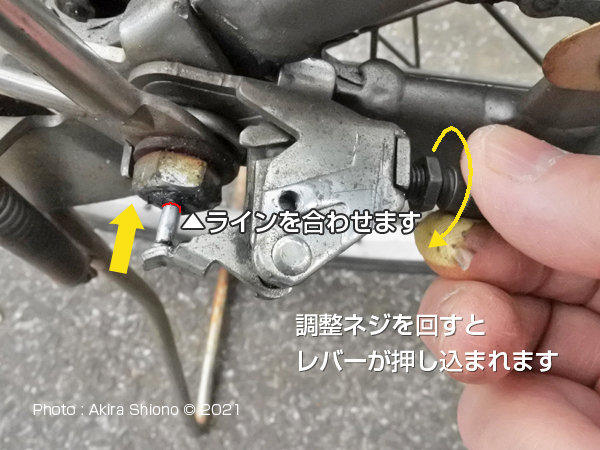 ![]() 変速レバーを2速に変え、シフトワイヤーのロックナットを10mmスパナで緩めます。 ![]() シフトワイヤーと固定ナットと調整ライン ![]() 調整ネジを回してラインとシャフトの端を合わせた後に固定ナットを閉めます。
