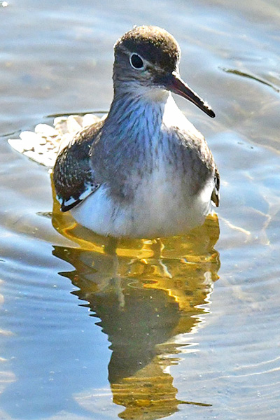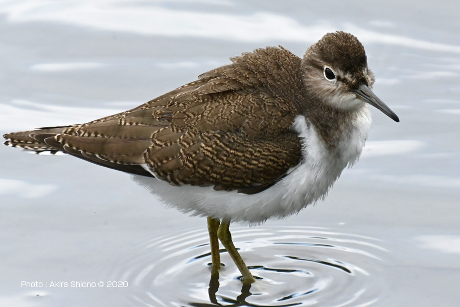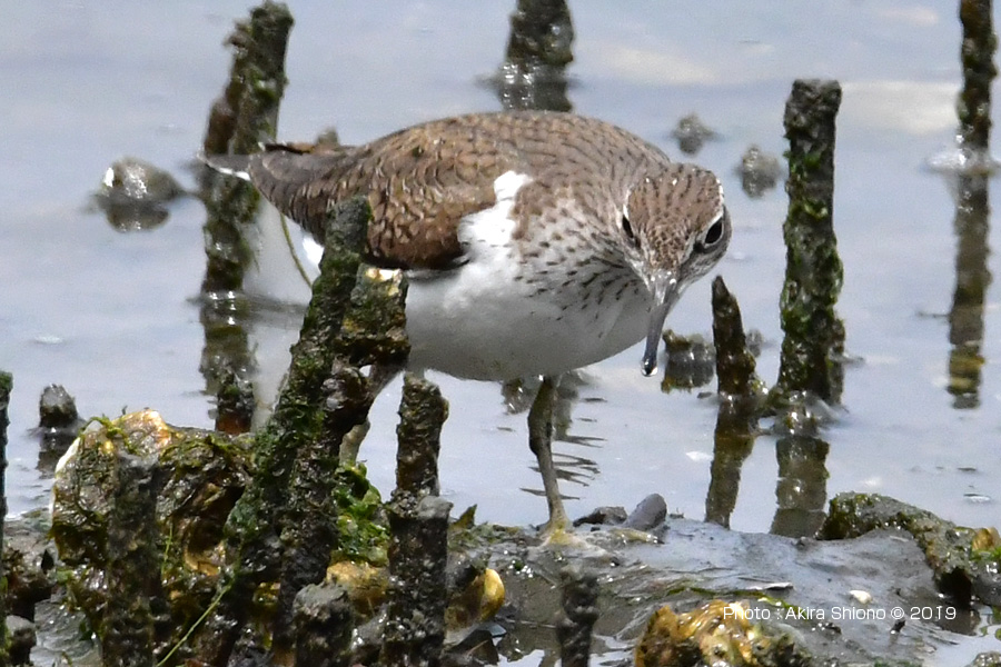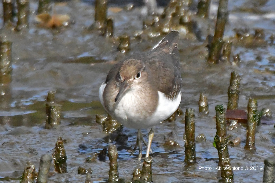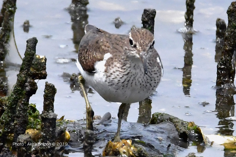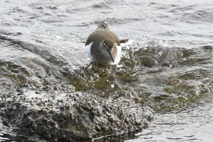 前から見たイソシギで羽の付けにの白い模様は前からでは丸く見えます。