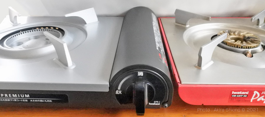 テーブル上で調理ができるコンロは以前、ガスホースを引っ張り一口コンロでその上に土鍋やすき焼き鍋などを乗せて使用していました。しかしホースをガス栓から引っ張るために、子供だった頃はホースに足を引っ掛け危なく大惨事を免れたことを思い出します。こんなことを知らない年齢層には、今は昔の話となってしまいました。 カセットガスコンロの新旧比較 トップへ カセットガスコンロが出た頃の形状が薄型になり、重心が低くなり安定性と卓上での高さを抑えたことで使いやすくなりました。現在販売されているIwataniカセットフー達人スリムⅢと近いデザインになっています。当初使いやすさ重視の設計から現在のものは、さらに省エネ性能を追求し、同じ能力で更にガス消費を少なくしました。また3.3kwの同じカロリーの製品2014年のAP-14に比べ湧き上がり時間を約17%短縮しています。これは、無駄に広がっていた炎の形状を変更したことで効果を得ています。 小型で性能がアップした新型カセットコンロ トップへ 今回使用期限のために買い替えをするのに、機種を選定しなければなりません。この時点で、人気があるのはIwatani カセット風ー達人スリムIIIで価格もこなれています。また、この製品は売れている様で専用ケースが別売りで用意されています。性能が良くて経済的なカス消費の物をターゲットにして商品を比べてみると、ECO PREMIUMという製品が目に止まりました。