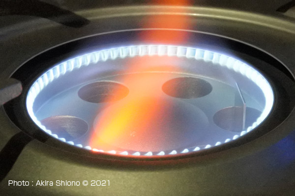 この製品を探す前に「タフまるJr.」を手に入れて使用していると炎の形がガステーブルの炎の粒立った形と違って、立ち上る形が一纏めになって鍋底に広がる形が気にいっていました。話はECO PREMIUMに戻りますが、このガスコンロは「内炎式バーナーを採用しています。この関係で無駄なく鍋底を加熱することができる様になりました。 巨大な内炎式バーナーのECO PREMIUM トップへ