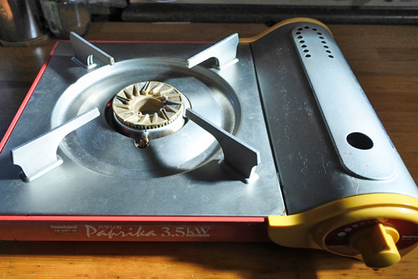 もう一つの特徴として、バーナーの位置がカセットボンベの場所から離れて左端に移動しています。これは大きな鍋などを使用するときに、カセットボンベを覆って加熱しない様に考えられています。この説明書では10号の土鍋(直径32cm前後)に初めて対応とあります。これは4〜5人で使う鍋サイズの様です。この様に大きな鍋を使える様になりましたが、2003年製造のパプリカと比べると一回り小さくなっています。