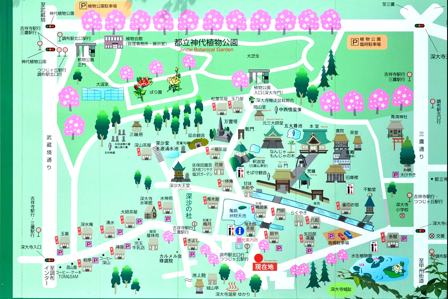 調布市のある深大寺は 天平5年(733年)満功上人が法相宗の寺院として開創したと伝えられています。859年に天台宗に改宗しました。1646年と1865年に火災に遭い、本堂の大半を焼失しました。現在の本堂は大正時代に再建されました。 深大寺界隈 トップへ 深大寺周辺は、観光地としてとても素敵な場所です。左の地図にありますように、お寺を中心として、都立神代植物園、神代水生植物園、数々の茶屋、そば店が数々あります。武蔵境通りから深大寺入口を入ると、緩やかにカーブした道路は緑で覆われています。ここを進むとバス発着所が左手に見えてきます。ここが深大寺の正面玄関になります。左手には観光案内所があり、資料をいただけますのでまずは立ち寄りたい場所です。 深大寺門前のお店 トップへ 入口を進むと左手には鬼太郎茶屋が見えてきます。こちらは妖怪マンガで有名な水木しげるさんが描いた「ゲゲゲの鬼太郎」の茶屋が開いています。緑と石畳の門前の道には味があるお店が多くあります。楽焼きのお店、土産物店、蕎麦店、茶屋と昭和の雰囲気を醸し出すお店が門前の道に軒を並べています。深大寺そばは有名ですので是非ご賞味ください。