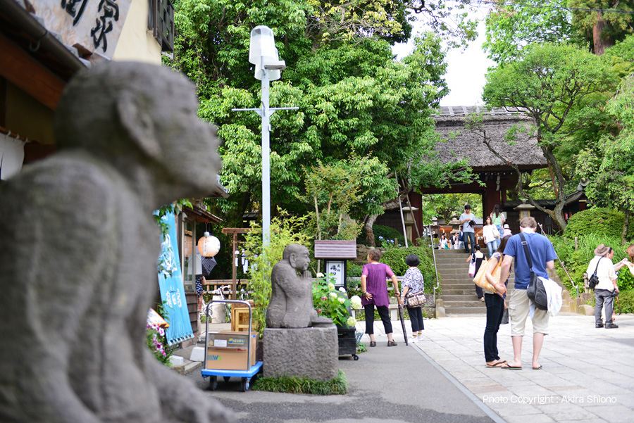 ![]() 左−鬼太郎茶屋はキャラクターグッズ販売のアンテナショップ? 右−山門前の嶋田屋からみた深大寺山門
