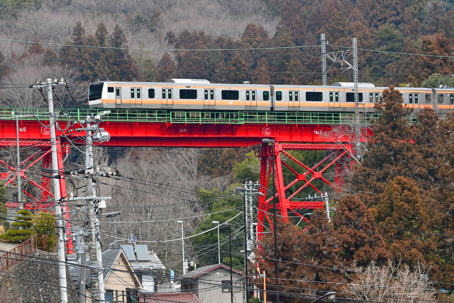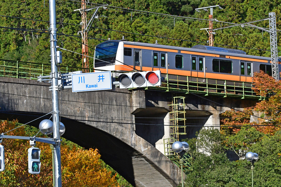 白丸駅近くの数馬峡橋から見たJR青梅線の車両とJR青梅線の軍畑駅東の奥沢橋梁を渡るJR青梅線車両。