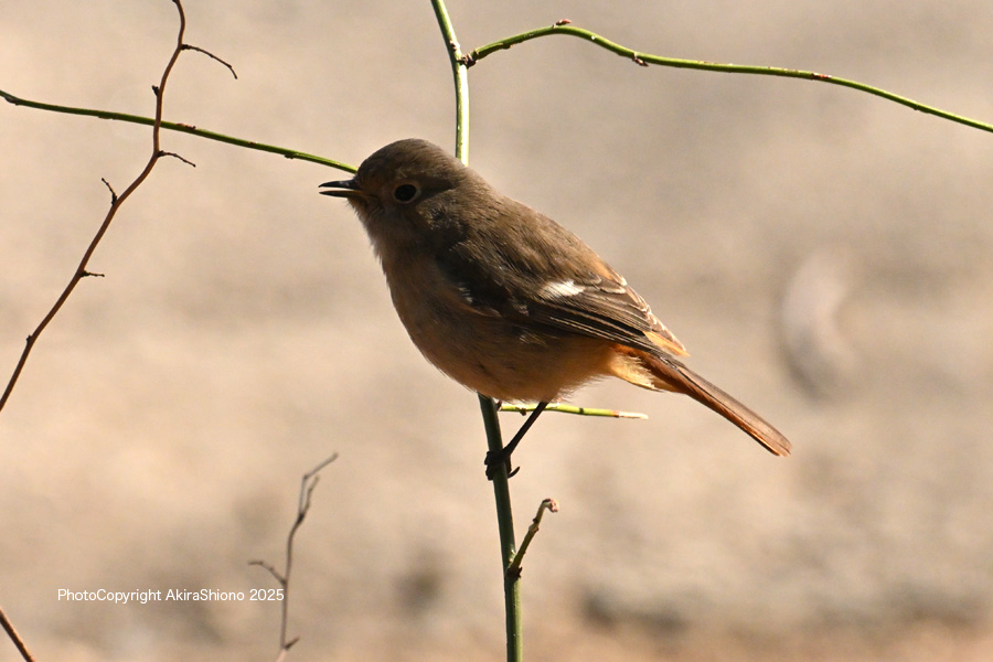細い枯れ枝に留まるジョウビタキのメス 撮影:NIKON Z50II+Z400 f/4.5S+TC-2.0 DX1200mm ISO 2500 1/1250 f13 0段手持ち 1.8倍トリミング 野鳥公園のジョウビタキのメス: 2月上旬 トップへ 探鳥をしに東京港野鳥公園に寄った時、林道の入江沿いの開けた草はらで何やら動くものがありました。早速1200mmで覗いてみると、正体は「ジョウビタキ」のメスでした。 ![]() 1月下旬、公園の杭に留まるジョウビタキ(メス) 撮影:NIKON Z9+Z400mm f/4.5 DXモード 1200mm相当 ISO3200 1/400 f20 0段 手持ち撮影 トリミング1.8倍 ![]() 1月下旬、公園の杭に留まるジョウビタキ(メス) 撮影:NIKON Z9+Z400mm f/4.5 DXモード 1200mm相当 ISO3200 1/400 f20 0段 手持ち撮影 トリミング3.5倍 狭山丘陵のジョウビタキのメス: 12月下旬 トップへ ![]() 12月下旬、狭山丘陵の木の枝に留まるジョウビタキ(メス) 撮影:NIKON Z9+Z400mm f/4.5 DXモード 1200mm相当 ISO4000 1/1250 f13 -1段 トリミング ![]() 12月下旬、狭山丘陵の気の枝に留まるジョウビタキ(メス) 撮影:NIKON Z9+Z400mm f/4.5 DXモード 1200mm相当 ISO16000 1/1250 f13 -1段 トリミング ![]() 12月下旬、狭山丘陵の気の枝に留まるジョウビタキ(メス) 撮影:NIKON Z9+Z400mm f/4.5 DXモード 1200mm相当 ISO4000 1/1250 f13 -1段 トリミング 玉川上水遊歩道のジョウビタキのメス: 10月下旬 トップへ 10月下旬のジョウビタキのオス トップへ 12月中旬:葦原のジョウビタキ トップへ 12月中旬:葦原のジョウビタキ トップへ ![]() 12月刈られた葦原の茎に留まるジョウビタキ