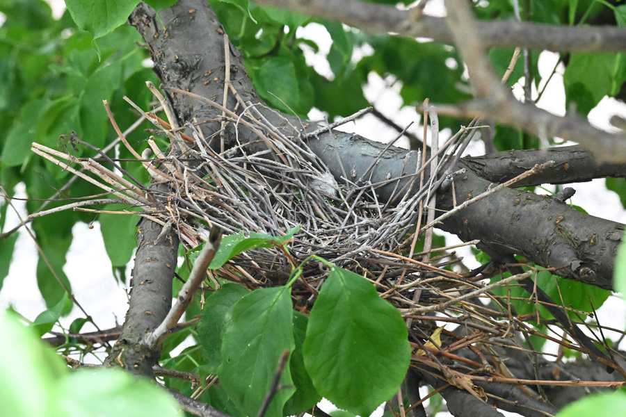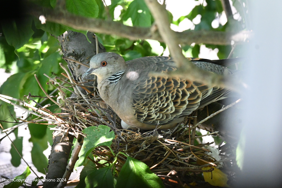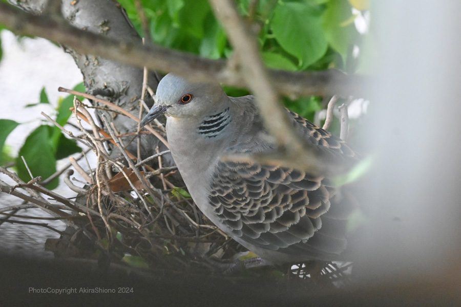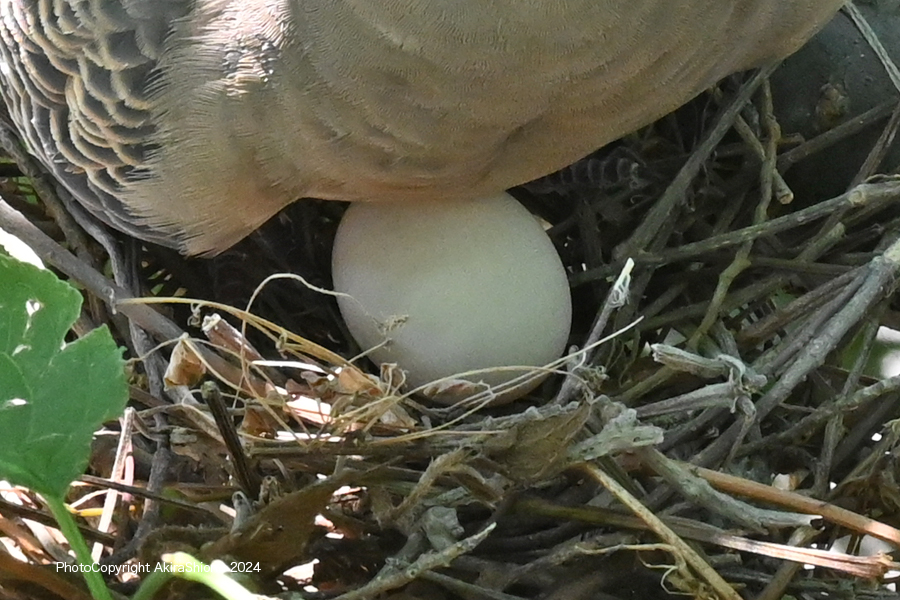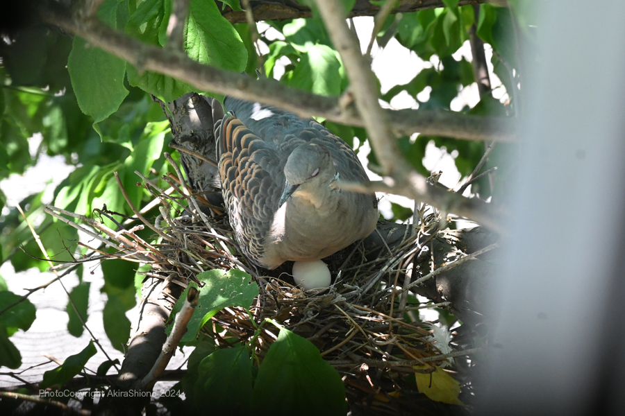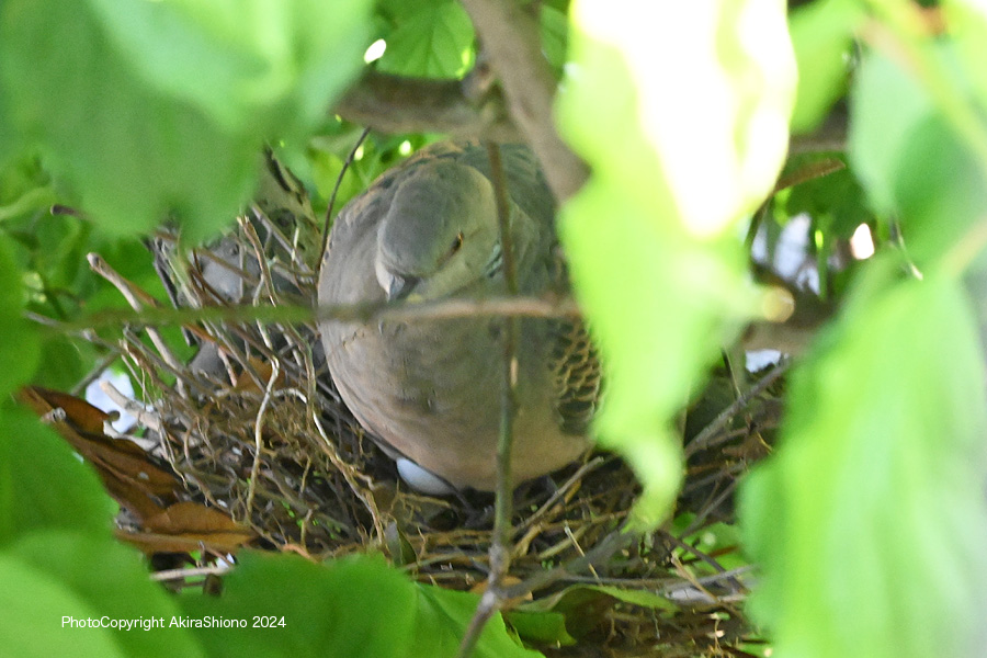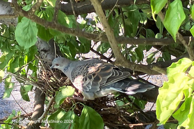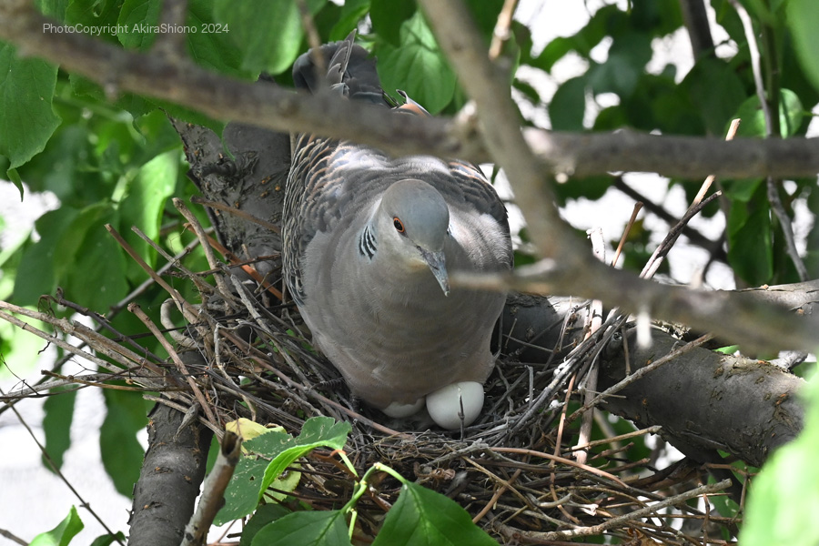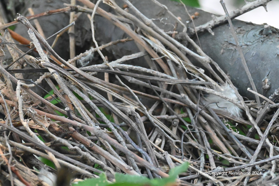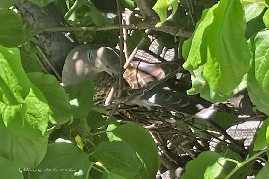 この日は、強風が吹き荒れ木の葉が強く横方向にバタバタと揺れていました。こんな中オスがせっせと運んできていた、枯れた細枝を木の枝の又部分に引っ掛けて作るのですが、卵が落ちない様に隙間なく作るのが難しいのでしょう。案の定枝分かれして落ちにくそうな形の枝でさえ地面に落下していました。 産卵していたキジバトの巣 撮影:2024.5.11 トップへ
