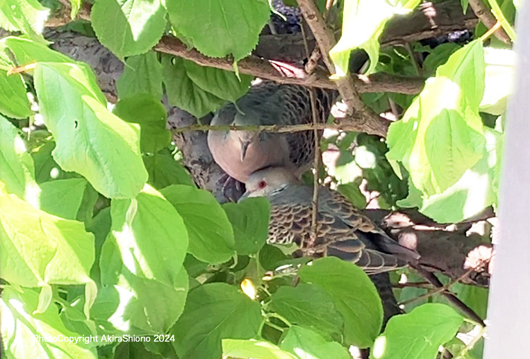 キジバトの巣がもぬけの殻になってから1週間くらいすぎると近所からキジバトの鳴き声が聞こえてきました。数日経つと早朝4時半くらいに近くで鳴いていました。まさかと思って元の巣をそ〜っと覗いてみると、葉に隠れているキジバトの後ろ姿が見えました。 撮影:iPhone SE3 640x480pixにリサイズ 30fps 2024.05.29 度々確認に来るキジバト 撮影:2024.5.28 トップへ
