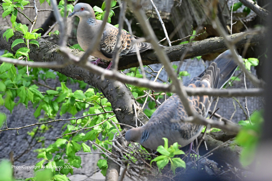 以前は、何かに怯えた様に温めていた2つの卵を残し巣を離れていきました。一旦は戻ったものの、次回観察した時にはすでに抱卵していたキジバトと2つの卵の姿は消えていました。それが前回のもぬけの空になったキジバトの巣の状況です。 巣の状態の確認?に戻って来たつがい 撮影:2025.4.18 トップへ