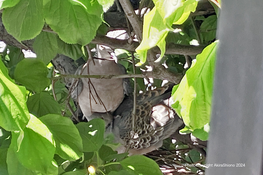 このところ午前5時前から2mほど離れた梅の木に前回作った古巣の上にキジバトがやってくる様になりました。流石に寝不足になるので雨戸も閉める様にしました。朝になって雨戸を開けると古巣にはキジバトが座っています。雨戸を開けた時はビクッ!としていますが、逃げることもなく座っています。 2つに増えていたキジバトの卵 撮影:2024.6.20 トップへ