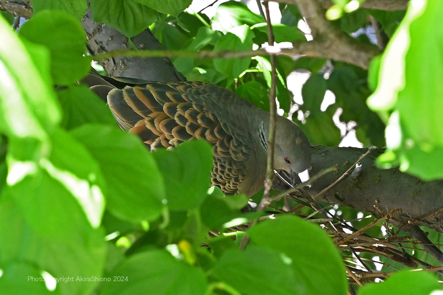 キジバトの巣がもぬけの殻になってから20日位過ぎました。その間何回も明け方に巣にやって来て低い声で鳴いています。抱卵していた時のキジバトと比較してみると何となく似ている気がしますが、確証は持てません。しかし縁もゆかりもないキジバトが巣にやってくるのかはわかりません。こんなことから親なのか他人なのか判明しないままこんな状態が続いています。巣作りをしていた時は、オスが小枝を運んでいる姿を何回も確認していますがそれもありません。 産卵の準備をしたキジバト 撮影:2024.5.28 トップへ