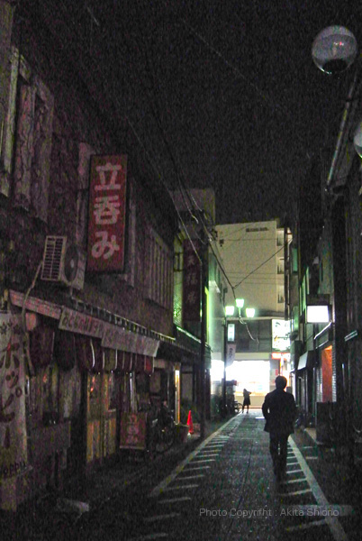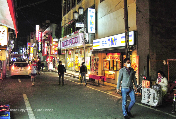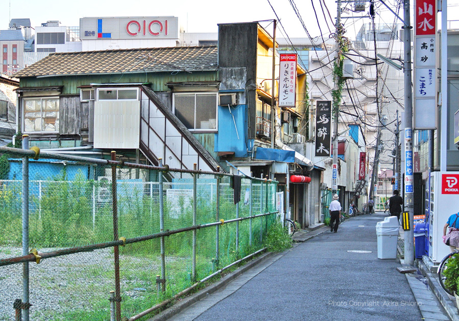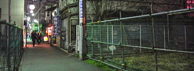 ![]() 手前の柵内は一時駅前駐輪場でした。駅方向には“りきホルモン”、“馬酔人(あしび)”、あかちょうちんへと続く