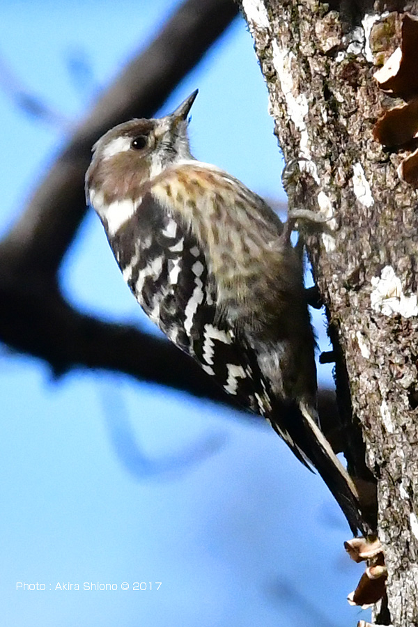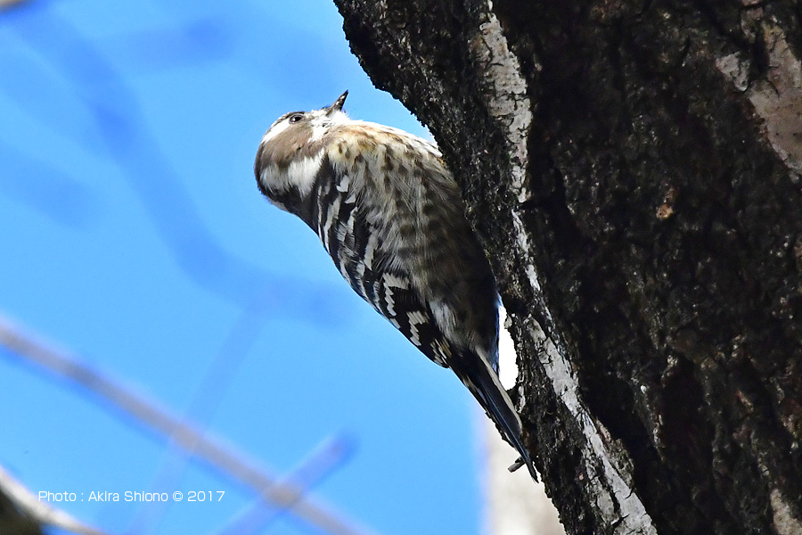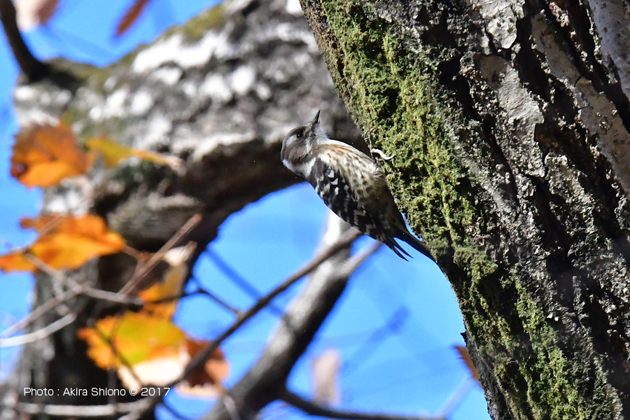 ![]() 写真ー木の幹のくぼみに潜む虫を、念入りに探すコゲラ。