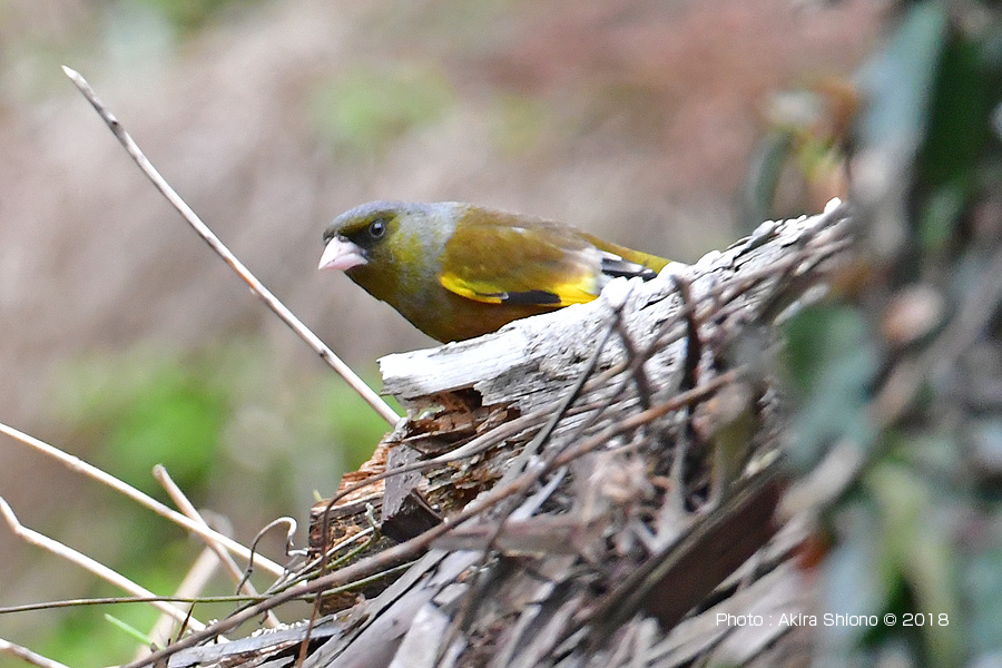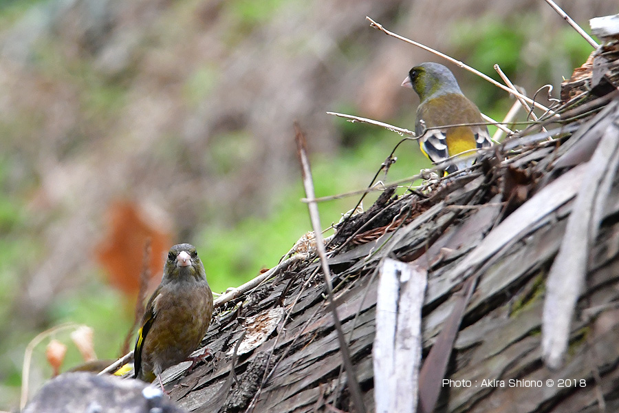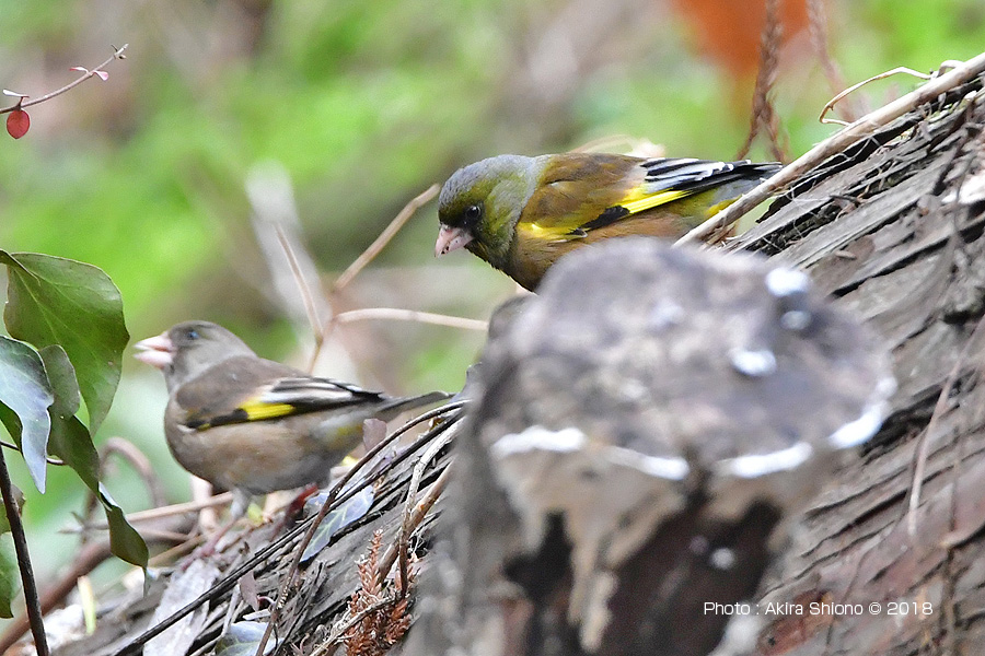 斜面に横たわる倒木の上に留まり虫などの餌を集団で探すカワラヒワ