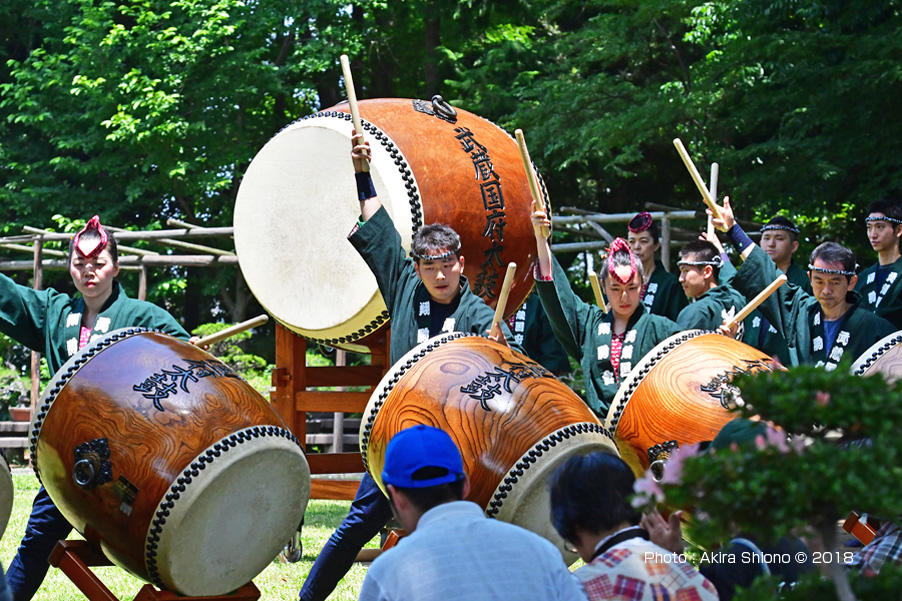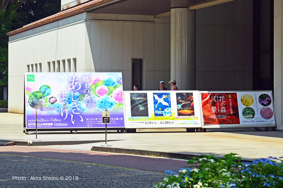大人入園料300円を支払いゲートをくぐると、右手には「博物館とプラネタリウム」があります。このH30の今年は5/26〜7/8まで「郷土の森 あじさいまつり」が開かれ、博物館前に好い気なポスターが掲示されていました。またこの日は、博物館前の芝生で、武蔵国府太鼓 翔駒会演奏会が行われ観客が鳥囲むように大太鼓などの迫力のある演奏を楽しんでいました。