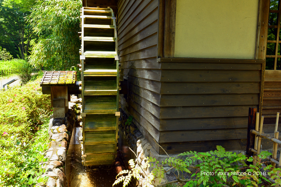 かつて武蔵野地方に広く見られた水車を復元(新築)したものです。府中市域でも、立川段丘崖下(ハケ下)に広がる水田地帯は、網の目のように水路が拓かれ、昭和の初め頃までは、そこにいくつもの水車が活躍していました。この地方の水車は、土地が比較的平坦なため、山間部に見られるような地形の落差を利用した上掛け式の水車ではなく、下掛け式もしくは胸掛け式とよがれる水車です。ここに復元した水車は胸掛け式で水輪の下の水路を彫り込んで落差を設け、回転に勢いをつけさせてものです。小屋の内部には石臼1基、竪杵3基が備えられ、製粉や精米・ワラ打ちなどができる仕組みになっています。