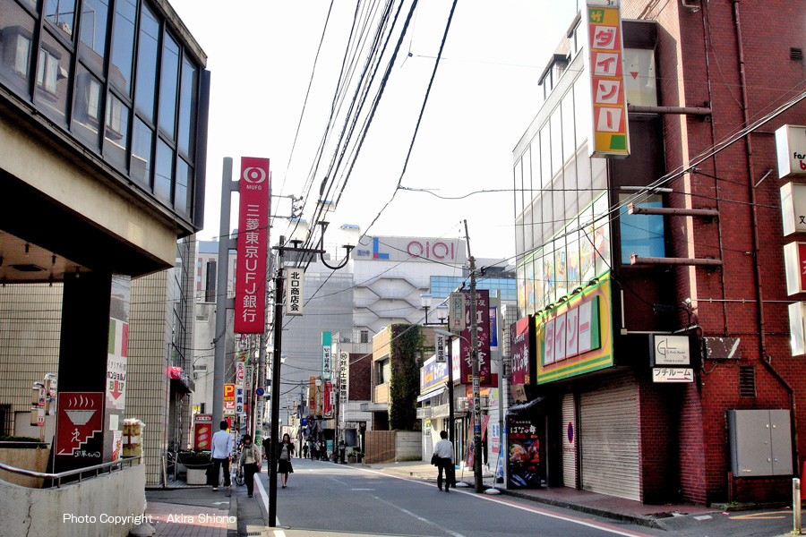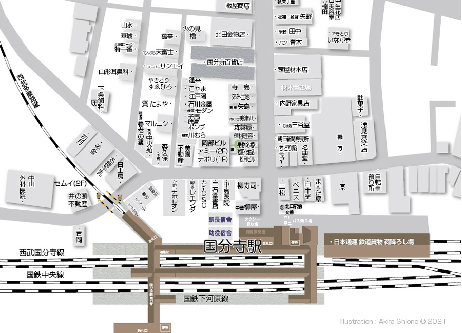上のイラストは、さらに4年程前の2009年の再開発開始前の北口周辺のマップです。上の地図と比較してみますと、再開発用地がまだ少なく、北からでは丹野オリエントプラザ、バザールKなどがありました。その西側に3つあった駐輪場も姿を消しております。 再開発前の国分寺駅北口大通り トップへ