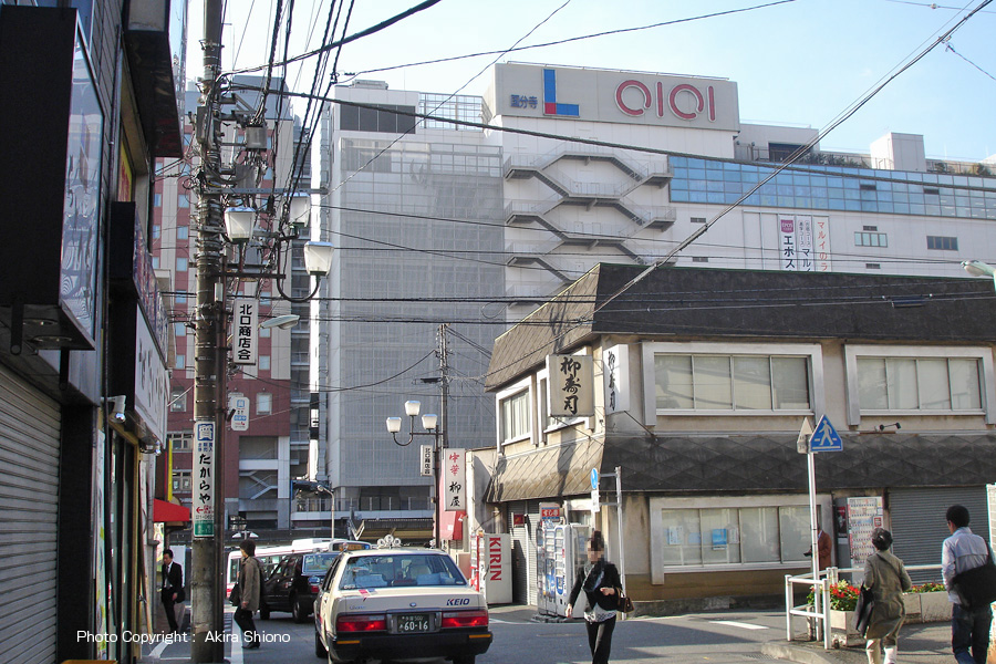 上のイラストは、2013年の再開発開始前の北口周辺のマップです。この頃は所々の土地買収が始まるものの用地買収はは未だ途中の段階です。国分寺駅北口正面のパチンコ店の左脇の路地の左側と、一時駐輪場で利用されていた場所が空いています。また、北口大通り側では、トップを切って矢島商店(八百よっちゃん)が用地を売却しましたがその後数十年、様々な環境・経済の変化によって停滞してしまいました。そのなかでも再開発用地の中心にあったのが、国分寺百貨店(後のバザールK)です。昭和30年代創業の歴史あるお店も、老朽化でバザールKとして形を変えていました。しかし再開発の用地として姿を消してしまいました。 再開発前の街並 2009年 トップへ