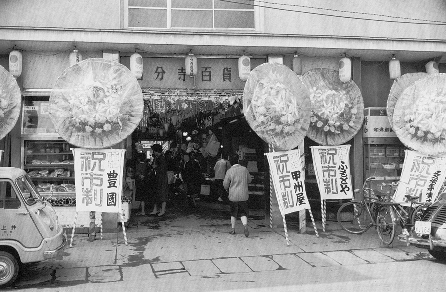 国分寺百貨店 スーパー登場前までごった返していた集合店舗 移 動: 孫の湯(東恋4) 養老の滝北口店(本町3) 星野模型店(本多1) 山崎商店(東元3) はたまん(本町2) 梨花苑(南町3) 白山房(本町3) 国分寺百貨店(〃) 時代を飾ったお店 多摩TV(本町2) 内野左官店 営業中: 名曲喫茶 でんえん(本町2) フジランチ(本町2) ろばや(本多1) 小料理 信濃(本町3) 1981年頃の国分寺駅北口と多摩湖線 トップへ 上の写真は市制施行当時の国分寺百貨店の入口で、当時のオーナーが町議会議員で応援の事でもあったのでしょうか?お祝いの花飾りが掲げられています。昭和39年(1964)で東京オリンピックが開催された年でその役1ヶ月後の11月3日でした。当時は集合店舗が少なく、中央線と西武線(多摩湖線・国分寺線)が結節するこの駅では周辺の買い物客でひったくりが出るくらい混んでいたと言われています。しかし昭和40年代に入ると近くにスーパー西友、オリンピック国分寺店が出来るなど商環境が変わってきました。消費者は徐々に個人店からスーパーへと移行していきました。 以下はみにこみ国分寺19号に掲載された記事を引用してあります。 みにこみ国分寺19号P3 「国分寺 今・昔 昭和39年頃の国分寺百貨店」(2003.10)より引用 再開発前にあったバザールKの前身の「国分寺百貨店」は昭和32年11月に開店しました。当時は木造建築で南・北の2棟で中央で通路で結ばれていました。そして天井は網入硝子がはめ込まれアーケードの様になっていましたが、後に冷房設備が入り天井はふさがりました。当時のお店は北棟大通り側北列から佃権(さつま揚げ)新井写真店(後に大黒屋履物店)、宮鍋(茶・海苔)、ふもとや(婦人服)、田中生花店、塩野商店。同じく南列は甲州屋(菓子)、天つる、汐船(加工品)、うさぎ屋(現マツヤ洋装生地店)、多根果物店、(中央通路)、なかやま(寿司・今川焼き)、金子洋服店、田中金物店でした。南棟北側の大通り側から、とらや椿山(和菓子)、なぎさや(加工食品)、ドール、中久化粧品店(中央通路)石川食品(後に多根)、白菊化粧品店、矢島青果店でした。南棟南側の大通り側から富士屋精肉店、豊国(菓子)、中久商店(雑貨)、鈴木鮮魚店、丸五食品(味噌等)、お茶金(乾物)になっていました。 昭和35年ごろの本町二丁目あたり みにこみ国分寺18号より トップへ