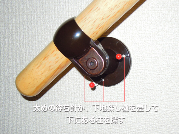 手すりの取付け高さは標準750mmといわれていますので、この位置で固定するようにします。石膏ボード壁の場合、柱の無い所は、全くネジが効かないので下にある柱を探さなければなりません。上でご紹介してある『ピン式下地探し機』があれば楽ですが、多少指が痛くなりますが、太めの玉付待ち針でも探す事ができます。