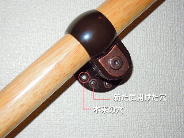 下地の柱を探してみると、手すり付属のマウントのネジ穴の位置では柱は細く幅から外れてしいました。2本のネジで固定するには不安が残るため、新たに4mmのドリルで穴をあけました。ねじ込みは壁に対して直角よりも柱に向かって斜めに穴あけした方が確実です。 修理部品と工具を見る