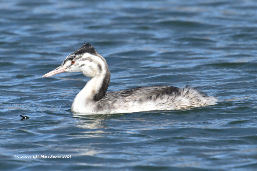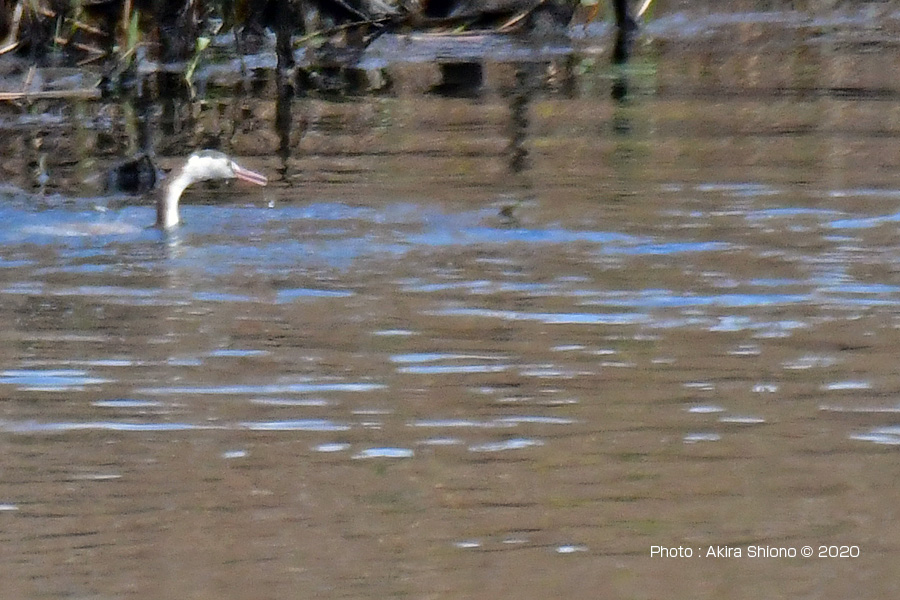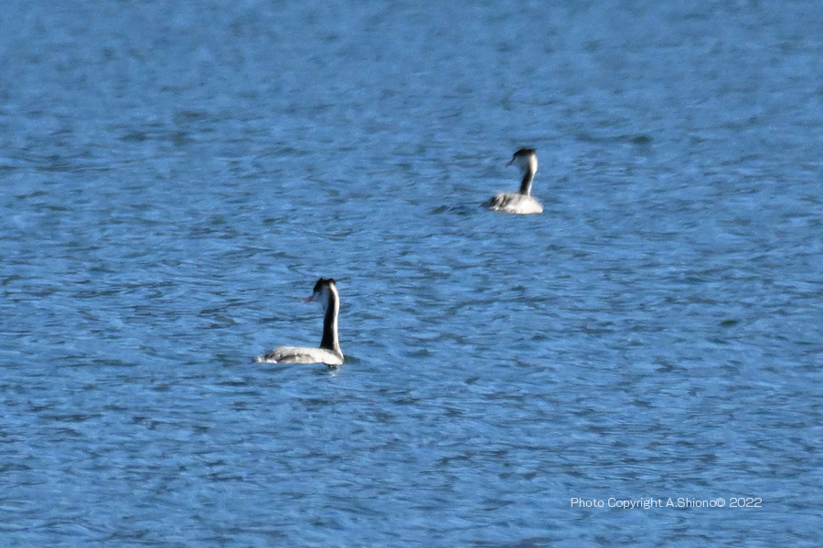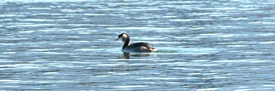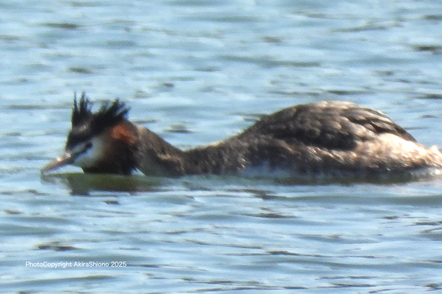 上のカンムリカイツブリの画像は休んでいるものですが、今回はかなり遠い場所で、ハンティングしている光景を目にしました。この時のレンズは、1050mm相当で肉眼ではなんの鳥か判別ができませんした。しかしレンズを覗くとこの鳥であることがわかりました。しかし距離がかなり離れていたため鳥は小さく写っています。 ![]() カンムリカイツブリのハンティングで、水面には逃げ回った魚でナブラが立ちます。