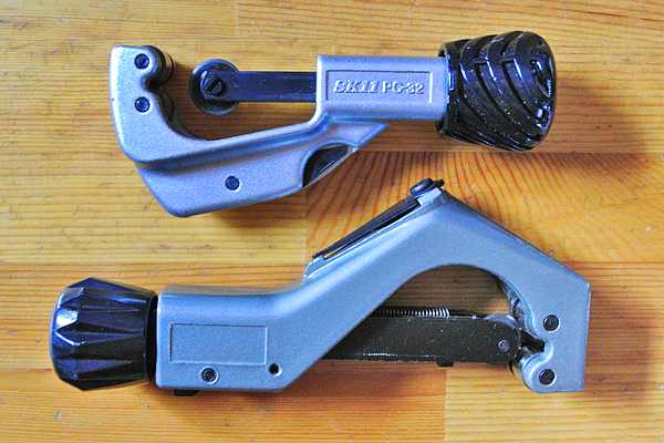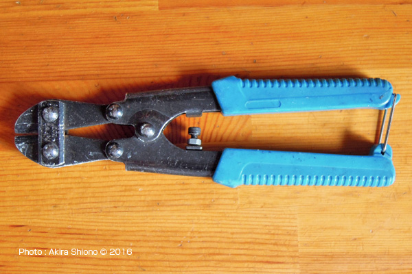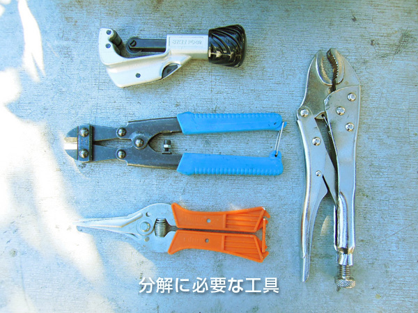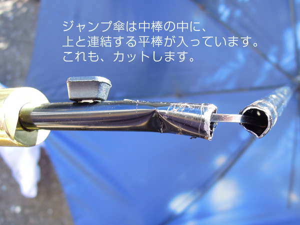 傘の中棒は、ジャンプ傘の場合、中に上部の止めを操作するために平棒が入っています。このおかげで少し分解しづらくなっています。普通の傘は、中棒はパイプのみですので幾分ラクになります。また傘骨は、ろくろ部で細い針金で束ねられています。これを外すと親骨はバラバラになります。あとは傘幕を外してしまうとバラバラになります。 ![]() ![]() パイプカッターが無い場合は、中棒を鉄ノコでカットします。ジャンプ傘で無い場合は折れる物もあります。