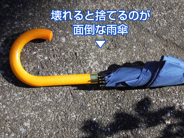 傘を分解して指定袋で捨てる 移 動: 分解分別 分解に使う工具 工具の説明 工具を調べる 分解作業手順 リンク: リサイクル・廃棄の下準備 ビン粘着ラベルをキレイに剥がす 缶ラベルをキレイに剥がす フードパックのラベルをキレイに剥がす 玉子パックを小さくする 焼き網を捨てる 食品の開封後の対策 傘の修理 傘を小さく捨てる 物干し竿を捨てる 分解して部品ごと分け、小さくする トップへ 傘は最近低価格の輸入物が増え、布製のジャプ傘が500円程度に手に入るようになりました。 低価格で手に入ると、壊れたら買えばいいやぁと感覚になります。同時に大切に使う感覚も薄れています。また悪いことに低価格の製品は、耐久性より価格重視で生産されているので壊れやすくなっています。 傘を長期間使用していると、強風で親骨が折れて使えなくなったり、日焼けして色が褪せてしまったりします。また、ビニール傘では露先とフィルム部分の接合部が千切れたりします。こんな状態では傘をさせませんので、結局廃棄することになります。 傘の構造と必要な工具 トップへ