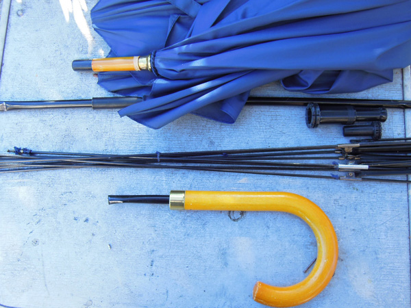 ![]() 針金を解くと受け骨がバラバラになります。作業がしやすいように傘布を露先の辺りで切り離します。