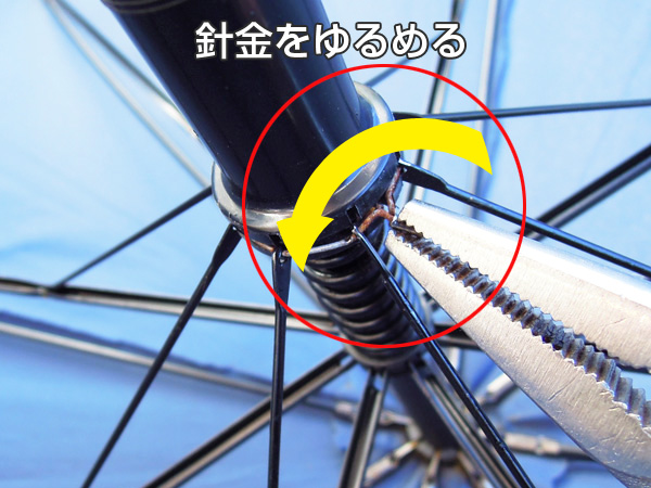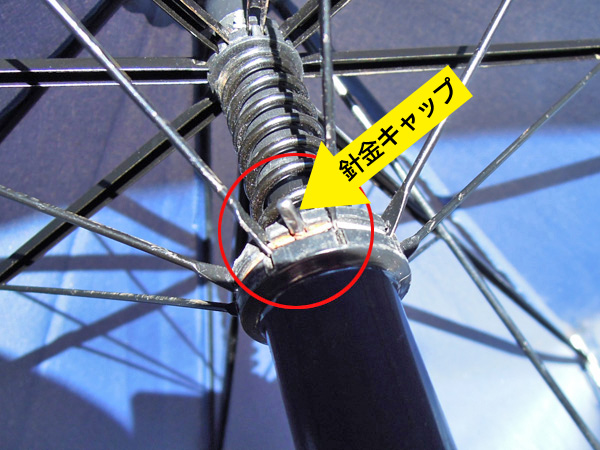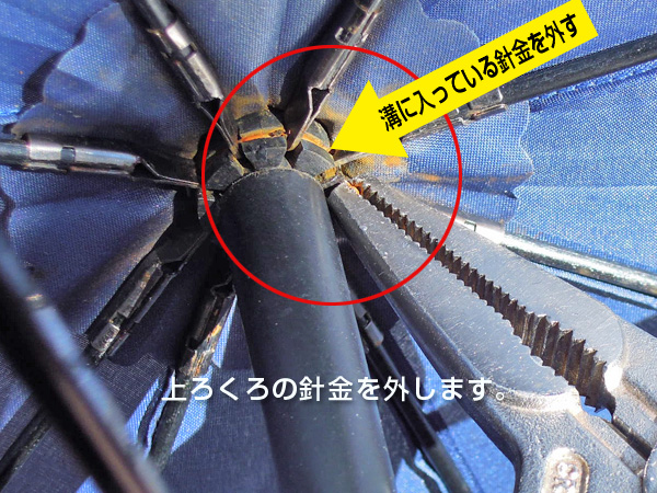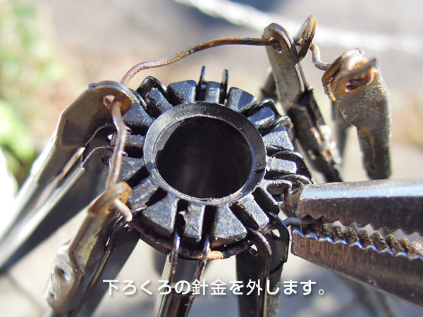 ![]() 下ろくろには、受け骨を縫うように針金で留めています。キャップが付いている場合は、外してから針金を解きます。