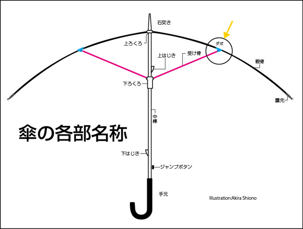 傘の構造は、大きく分けると『手元』、『中棒』、『親骨』、『受け骨』になっています。