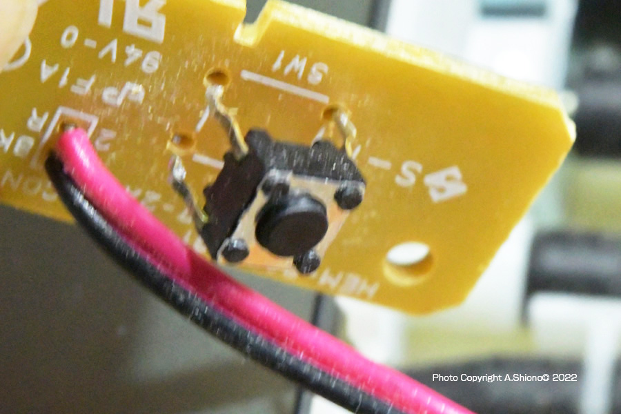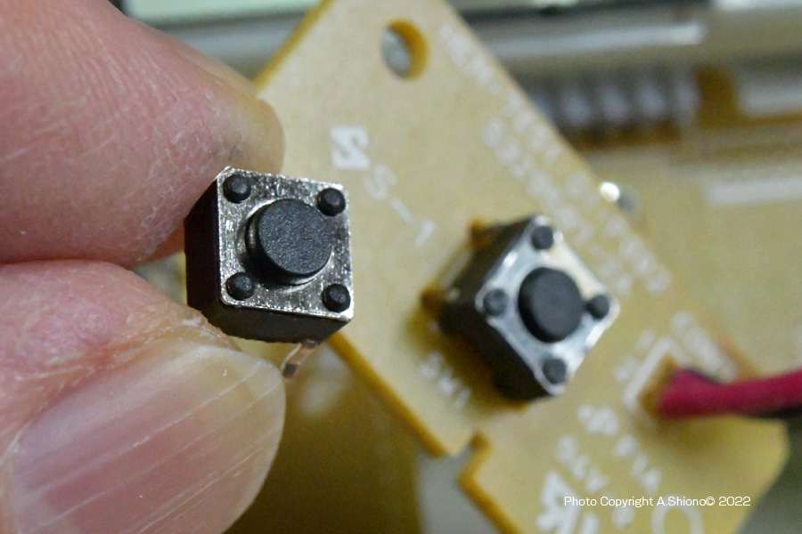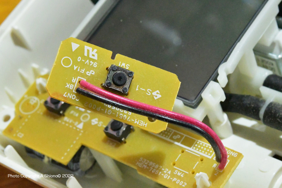 最近の樹脂で作られた小型家電(リモコンなど)はねじ止めの他、上のスイッチパネルのフックにを下の本体の受けがありこれで固定されている場合が多くなっています。この分解方法は、刃の薄いスクレーパーがあると簡単に上下を分けることができます。 基盤のタクトスイッチの場所 トップへ 本体右にあるオレンジ色の電源ボタンの、真下にタクトスイッチがあります。上の操作パネルを外してみると、液晶パネル下にある本体基板から少し離れた位置にスイッチ用基板がコードで繋がっています。 タクトスイッチの交換 トップへ タクトスイッチ 6x6x4.3mm10個入ほか