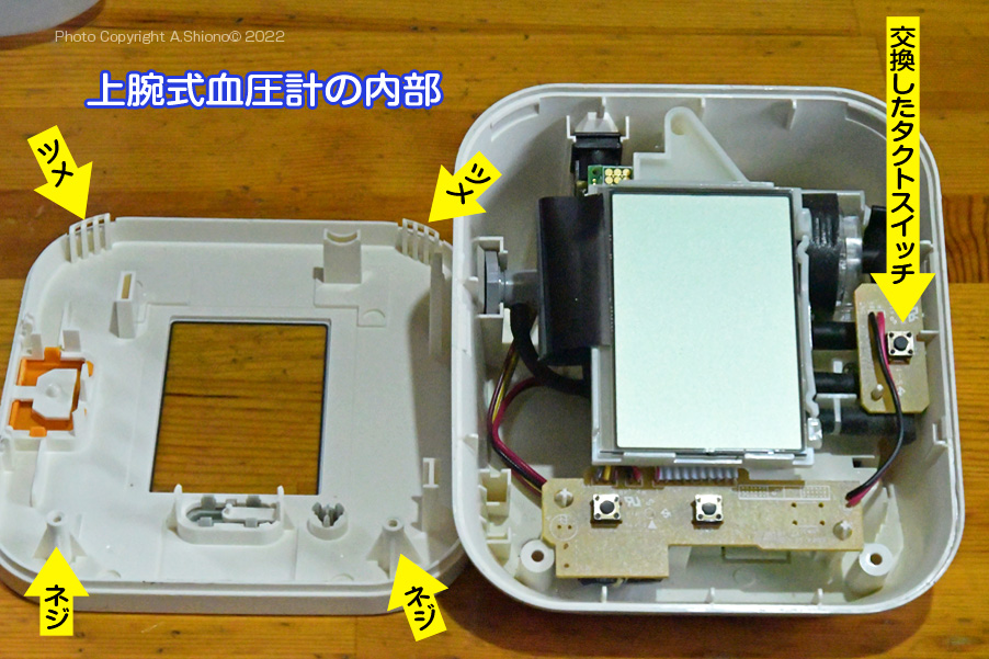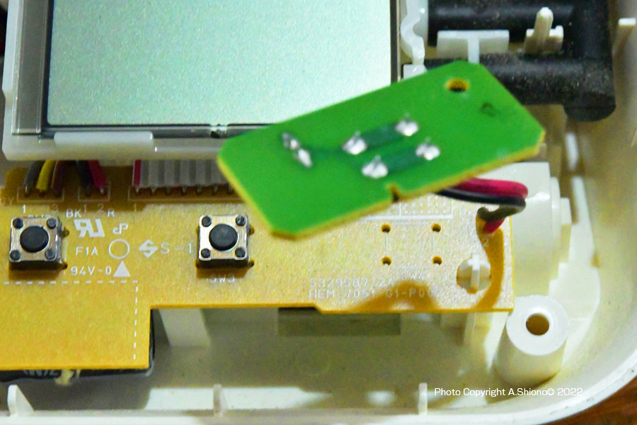 上腕式血圧計のスイッチ不具合対策 移 動: 長期間使用で出るスイッチの磨耗 血圧計本体の分解 基盤のタクトスイッチの場所 タクトスイッチの交換 動作確認と血圧計の組み立て リンク: 上腕式血圧計腕帯の修理 上腕式血圧計腕帯の交換 上腕式血圧計スイッチの交換 各種センサーライトの分解修理 センサーユニット交換はこちらから 長期間使用で出るスイッチの磨耗:上腕式用腕帯 トップへ