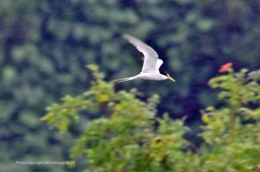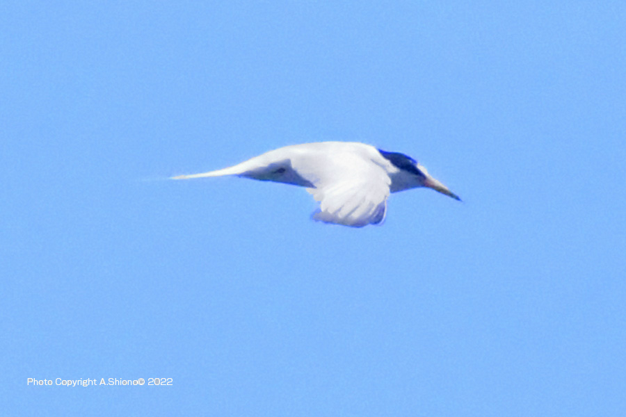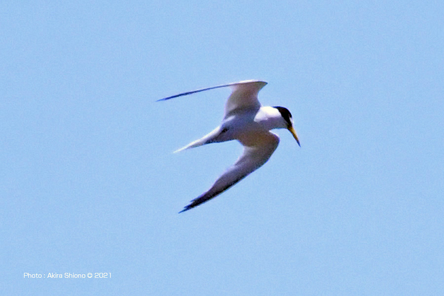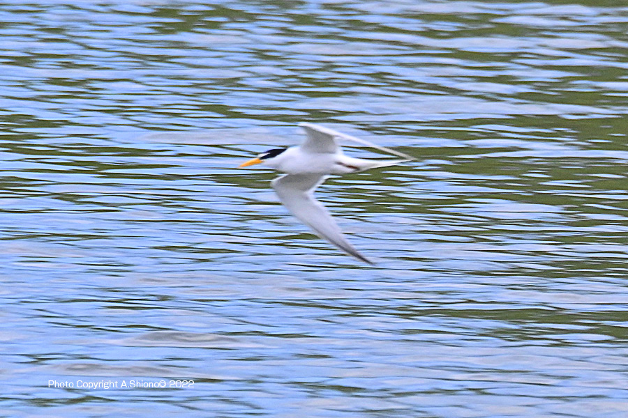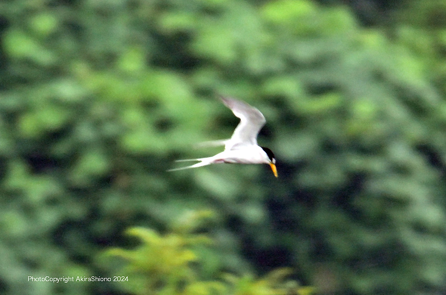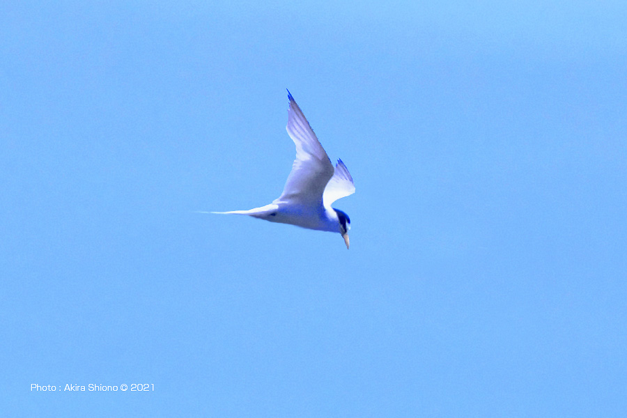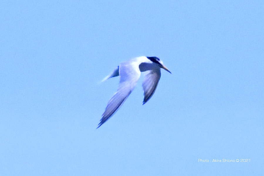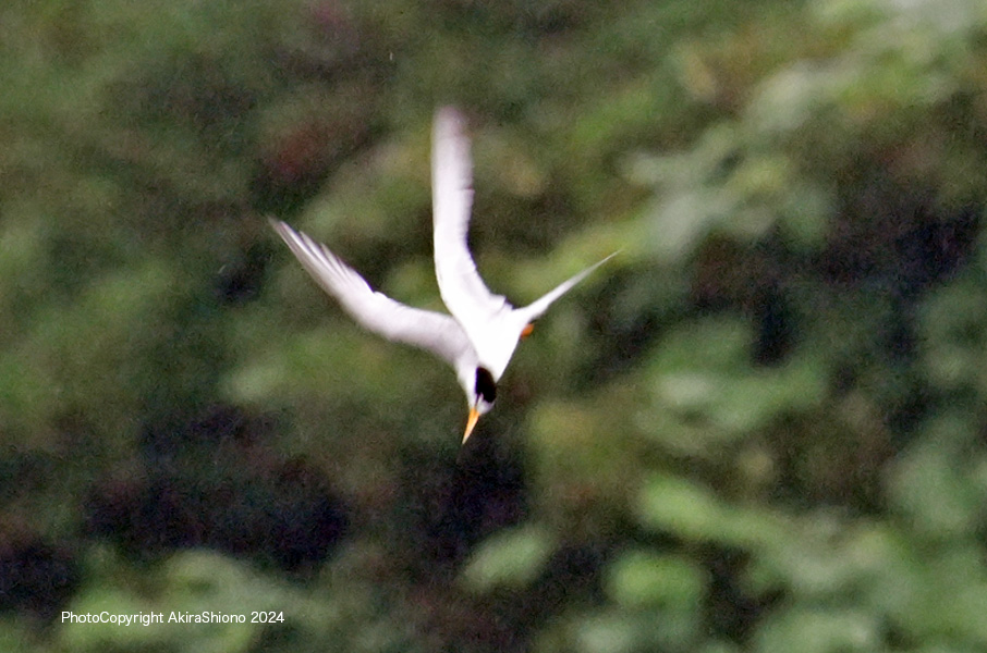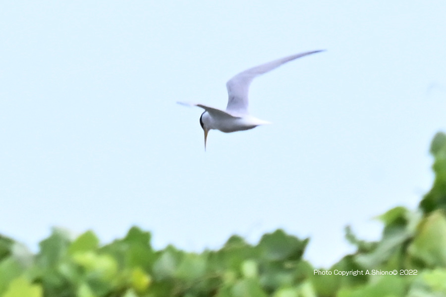 南から繁殖にやって来たコアジサシは、子育ての時期で餌取りで大忙しです。上空を旋回したり餌の魚が見つかると急制動を掛け、水面にダイブしたり忙しい鳥です。おまけに全長が約25cmしか無いため、鳥までの遠くに居ると非常に小さく見えます。写真を撮るためには広範囲の気配りが必要です。