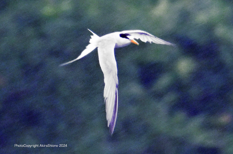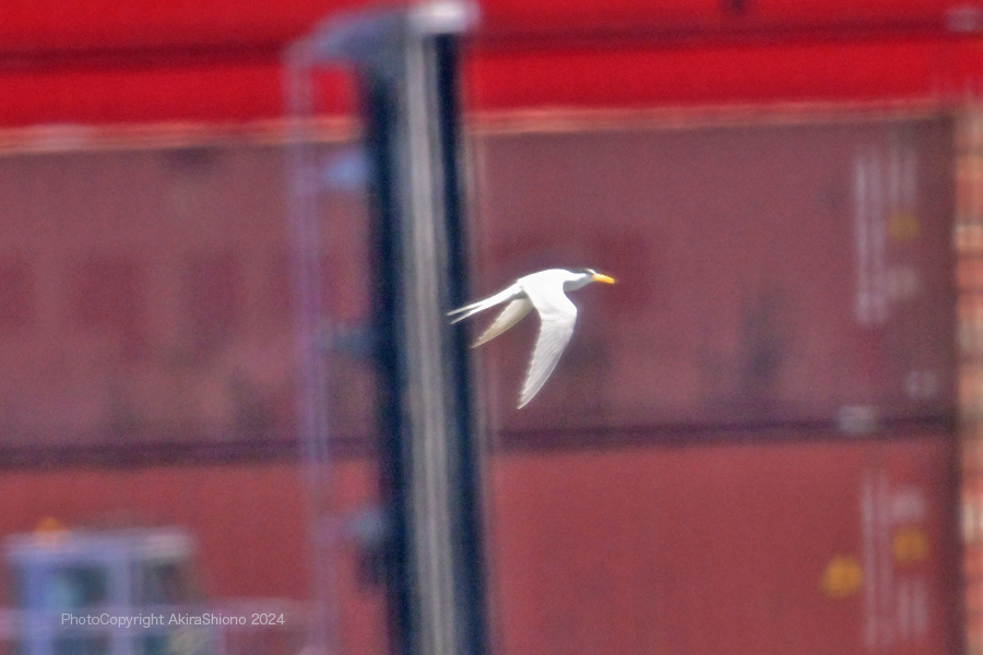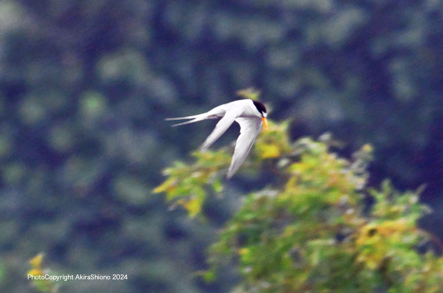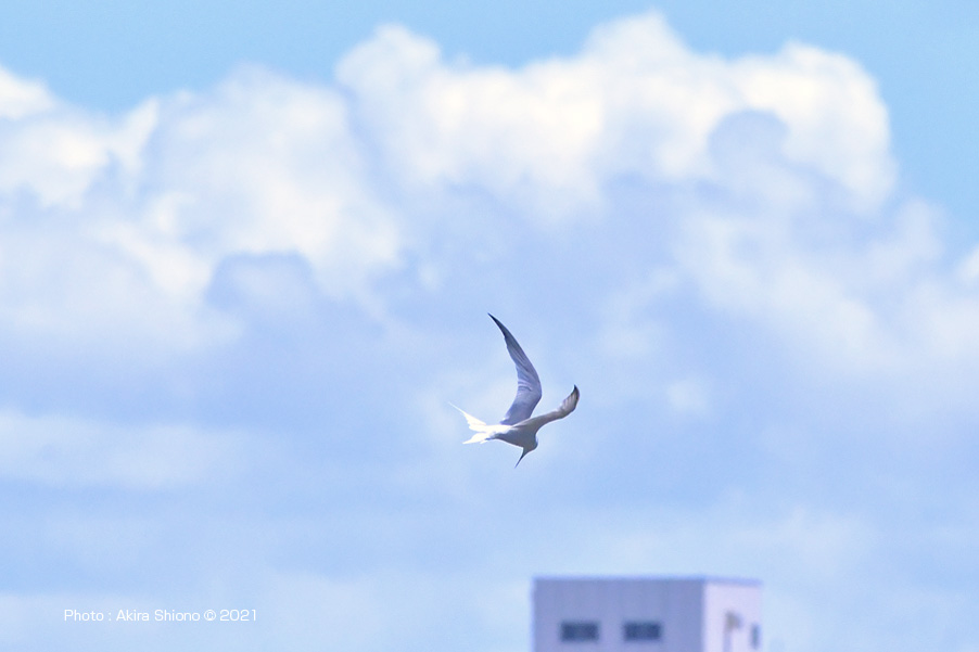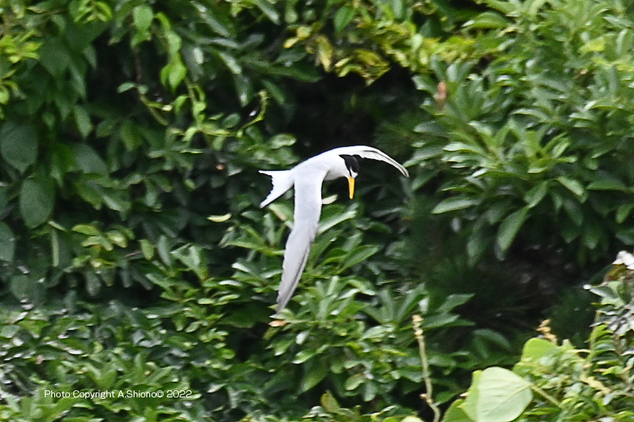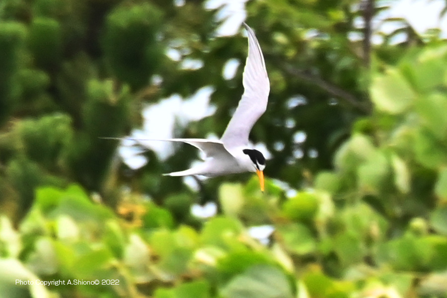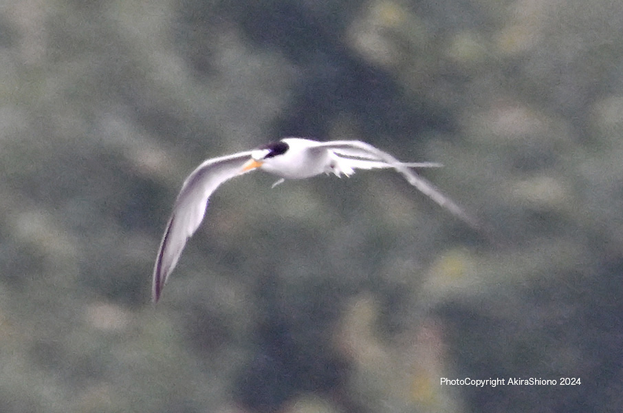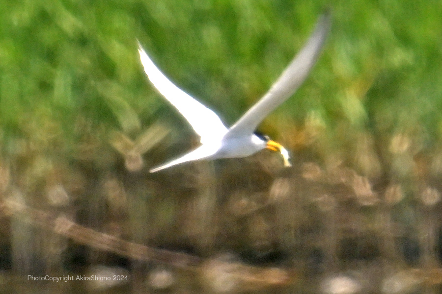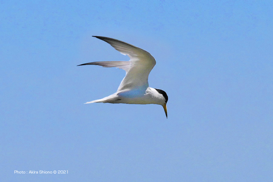 南から繁殖にやって来たコアジサシは、子育ての時期で餌取りで大忙しです。上空を旋回したり餌の魚が見つかると急制動を掛け、水面にダイブしたり忙しい鳥です。おまけに全長が約25cmしか無いため、鳥までの遠くに居ると非常に小さく見えます。写真を撮るためには広範囲の気配りが必要です。