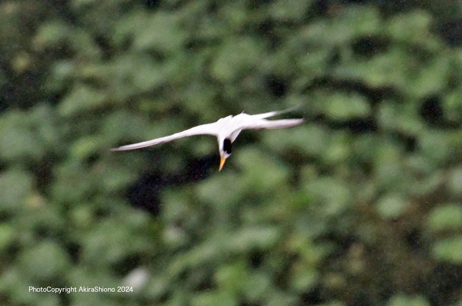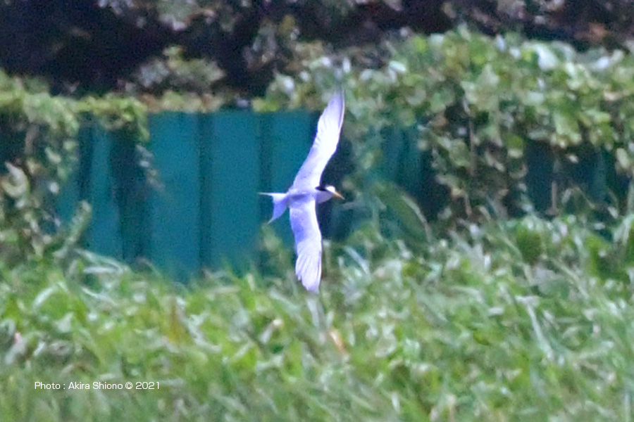 脚が生い茂る池の周りを旋回するコアジサシで、尾羽の両端が伸びています。