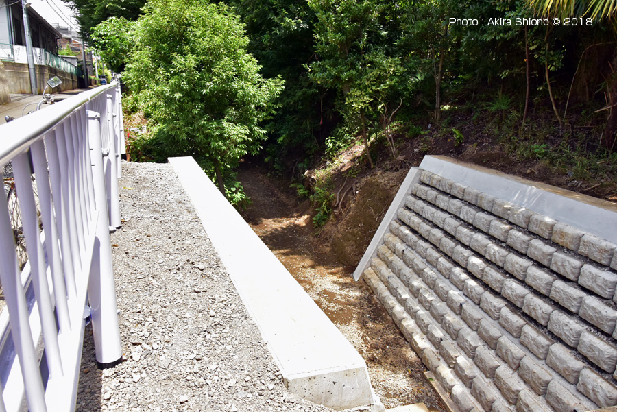 恋ヶ窪用水周辺緑地の西側に沿って伸びる旧鎌倉街道の道で、突き当たりは西武国分寺線の線路です。 周辺の恋ヶ窪用水路跡 トップへ 恋ヶ窪用水路跡は、この恋ヶ窪用水路周辺緑地の北側で見ることができます。現在は住宅が立ち並び、殆どがわかりにくくなっています。しかし、東恋ヶ窪4丁目の三和木材裏の東へ向かう道路にその痕跡があります。ここには、下の写真のように「仲よしばし」が架かっています。ここから南北を眺めると、北はサミットストアー恋ヶ窪店の南信号の東へ向かう道路の丁字路になっているあたりまで伸びています。南は西武国分寺線の線路脇の道路の手前まで、約300mあります。現在は植物などが植えられています。ここは昔、旧鎌倉街道があり、西国分寺駅北側まで続いています。
