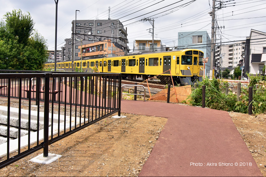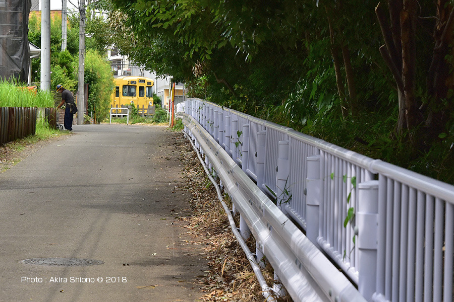 この用水路跡の南端は、線路で手前の道路で途切れています。