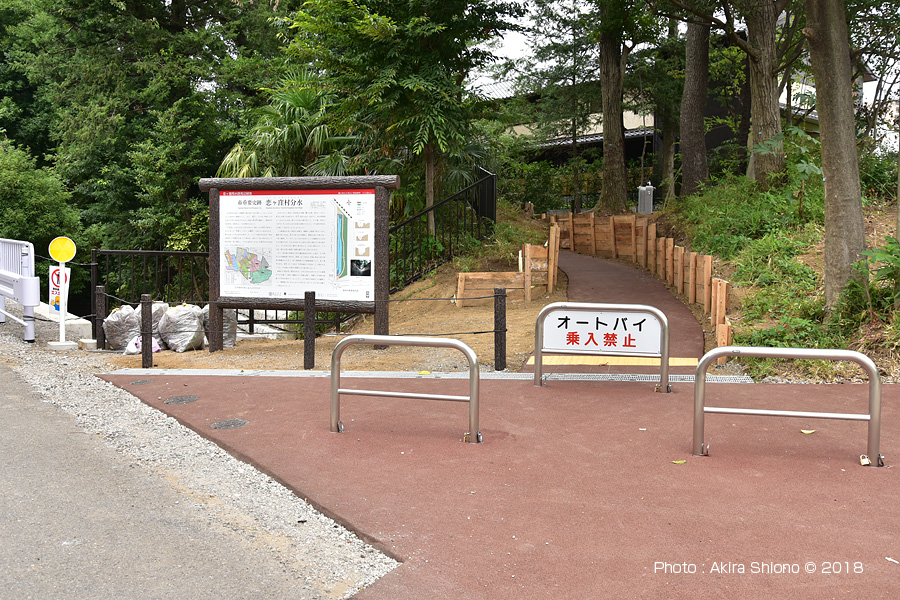 整備中の恋ヶ窪用水周辺緑地の南端には看板が設置されています。手前は熊野神社前交差点