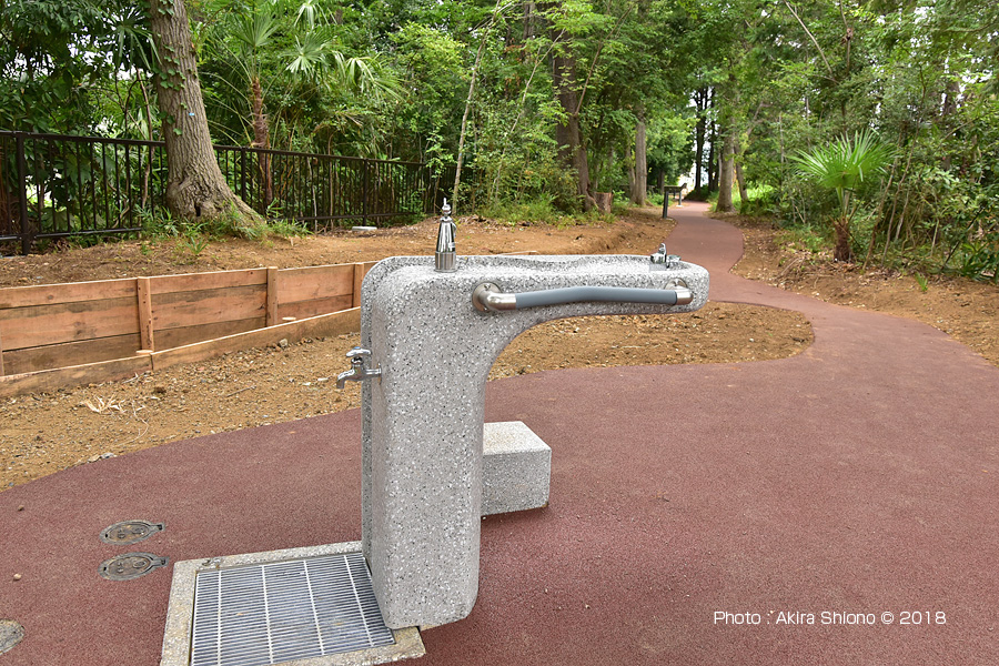 恋ヶ窪用水緑地の南側に設置された「水飲み場」で正面が熊野神社交差点。