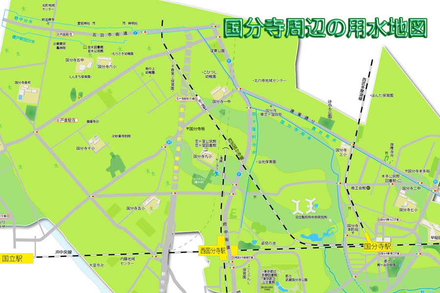 恋ヶ窪用水周辺緑地が整備されています 移 動: 用水周辺緑地の場所 恋ヶ窪用水周辺緑地南端 恋ヶ窪用水路跡 恋ヶ窪用水路跡東の遊歩道 リンク: 国分寺の用水はこちら 恋ヶ窪用水周辺緑地はこちら 恋ヶ窪樹林地はこちら 姿見の池緑地はこちら 国分寺崖線と市内の用水地図(2754x1874pix) 恋ヶ窪用水周辺緑地 恋ヶ窪用水周辺緑地の場所 トップへ