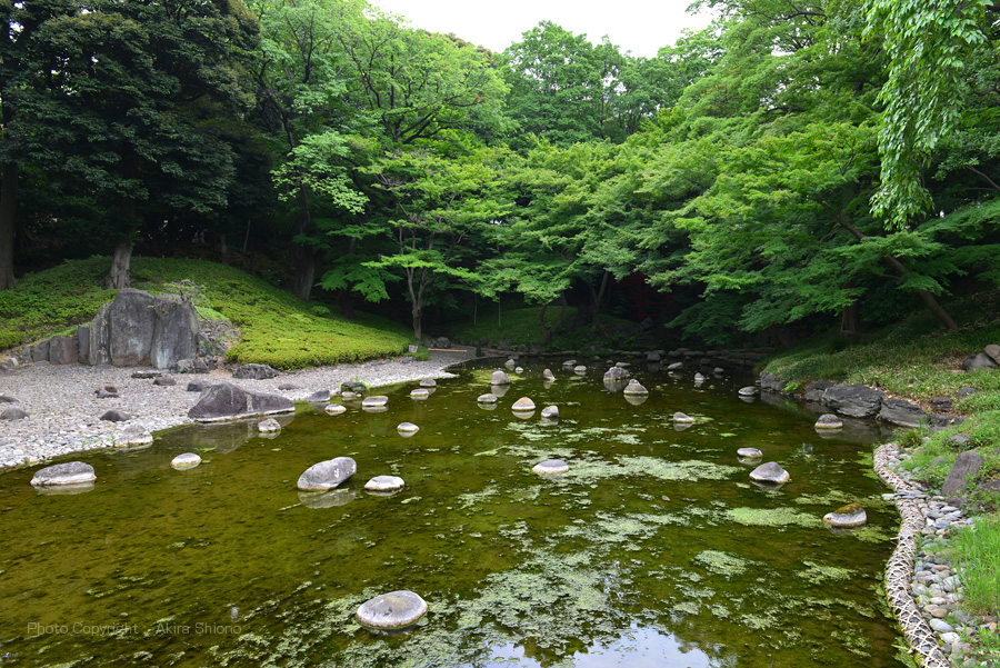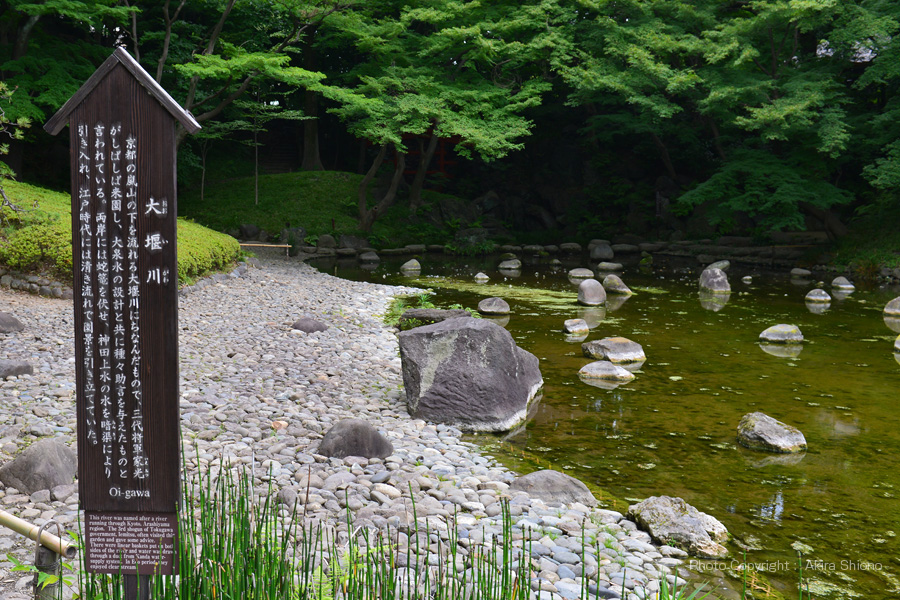 京都の嵐山の下を流れる大堰川にちなんだ、もので三代将軍家光がしばしば来園し、大泉水の設計と共に種々助言を与えたものと言われている。両岸には*蛇籠を伏せ、神田上水の水を暗渠により引き入れ、江戸時代には清喜流れで遠景を引き立てていた。