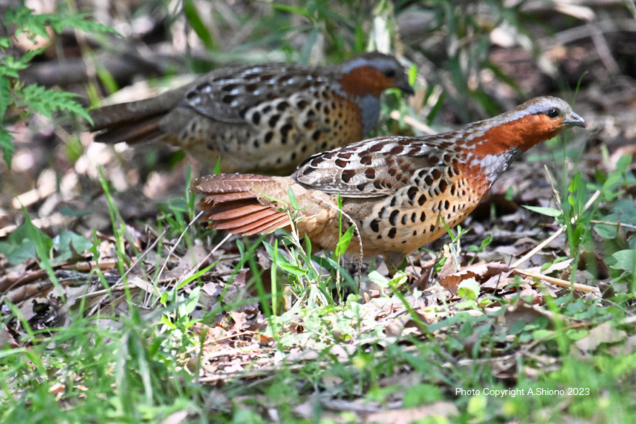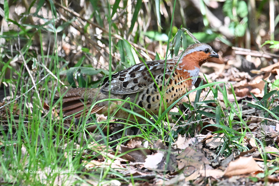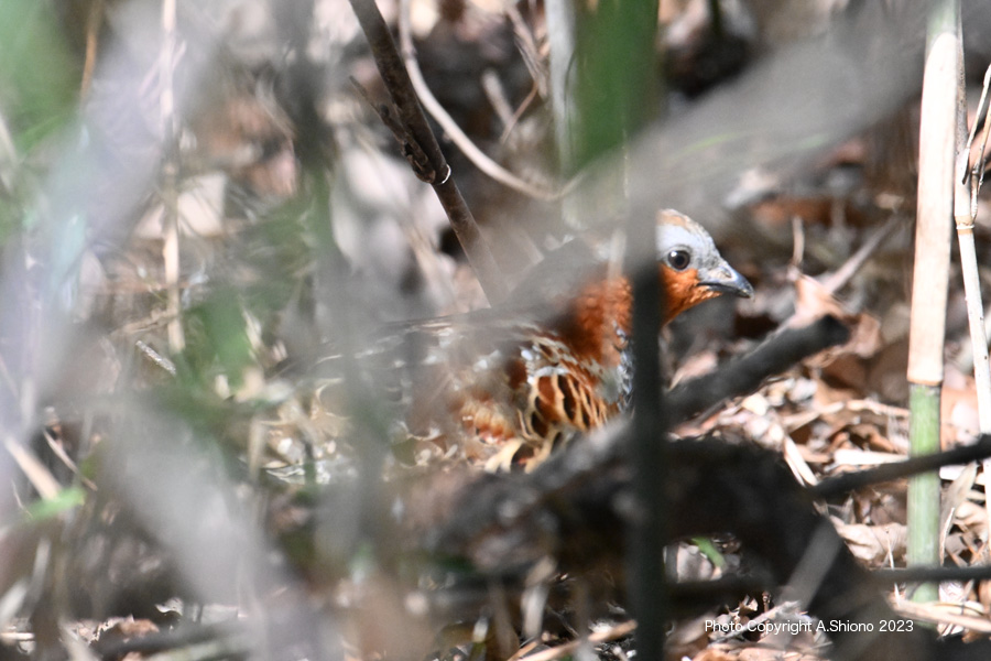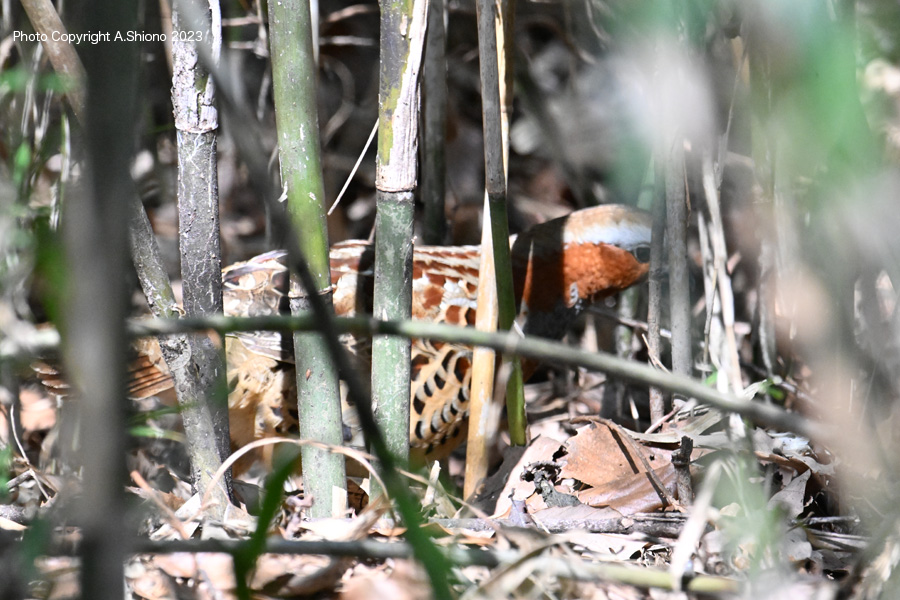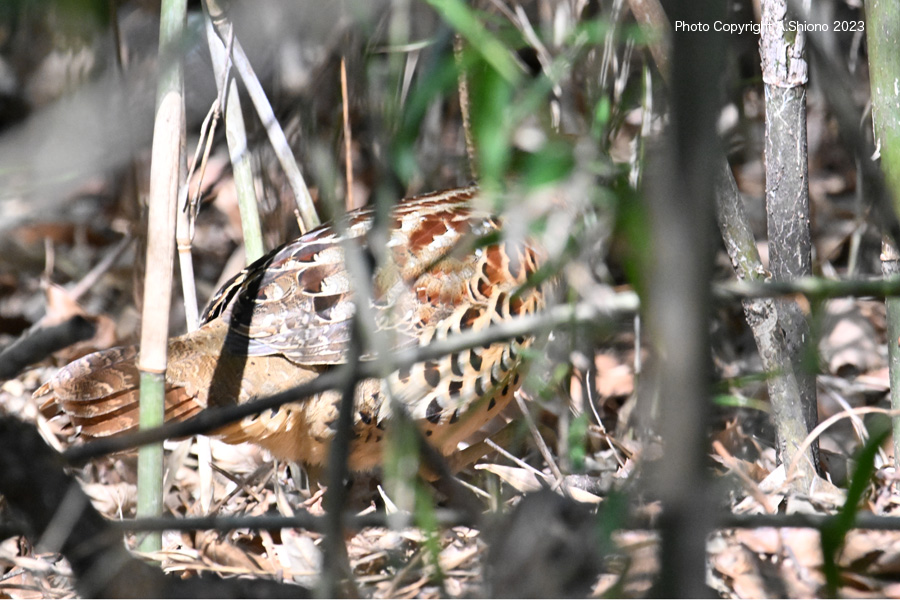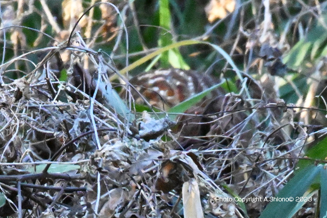 前回は、藪の中から顔を出したり藪の中を進んだりなかなか撮影が難しかったコジュケイですが、やっとチャンスが来ました。 ![]() 斜面に沿って植えてある低木の中から出てきた二羽のコジュケイ。 ![]() コジュケイのオス。形は首を縮めるとウズラで伸ばすとニワトリに似ている気がします。 ![]() コジュケイの後ろ姿で同伴ラグビーボールのような形に短い尾が生えているイメージです。 撮影:NIKON Z9+ZTC2.0x+Z400mmf/4.5VR f/13 FX:Lサイズ800mm ISO 6400 1/320 f13 0段 1.3倍トリミング手持ち撮影 藪の中を数羽で進むコジュケイ トップへ 前回は斜面の笹薮の中から顔を出した瞬間を撮影しましたが。今回は平地で見つけけ ました。しかし、笹薮の隙間を歩いていてオートフォーカスが全く使えませんでした。こんなことなので、レンズのフォーカススイッチをマニュアルに変更して撮影しましたが、ピントリングを調整しながら追いましたが、ピント合わせがとても厳しい撮影でした。薮の奥だったのではっきり全身は見えませんでしたが、親子らしい2〜3羽がいるようでした。こちらに気付いたのか、薮のさらに奥へ行ってしまいました。 ![]() 笹ヤブの奥で動く気配があり須川を表したのはコジュケイでした。 撮影:NIKON Z9+ZTC2.0x+Z400mmf/4.5VR f/13 FX:Lサイズ800mm ISO 6400 1/640 f11 +0.3段 2倍トリミング 斜面の藪の中から顔を出したコジュケイ トップへ 三脚を広げて道を塞いでいたカメラマンのレンズの先は藪の中、撮影の邪魔をしてはいけないと待っていたら、藪がゴソゴソとしだしました。カメラを構えて何かなぁ〜と覗くとなんと「コジュケイ」でした。深い藪だったので全身は見えずのままでした。撮った画像をみると、下に掲載の井の頭自然園にいたコジュケイよりも体の羽毛が滑らかで綺麗でした。 ![]() しばらくして、ヤブから顔をだしたのはコジュケイでした。(クリックでアップ画像) 撮影:NIKON Z9+FTZII+TC-20EIII+AF-S200-500mmE f/8 FX:Lサイズ560mm ISO 12800 1/6400 f11 0段 5倍トリミング 井の頭自然文化園のコジュケイ トップへ ![]() 今にも飛び立ちそうな、井の頭自然文化園のリス舎のコジュケイ。