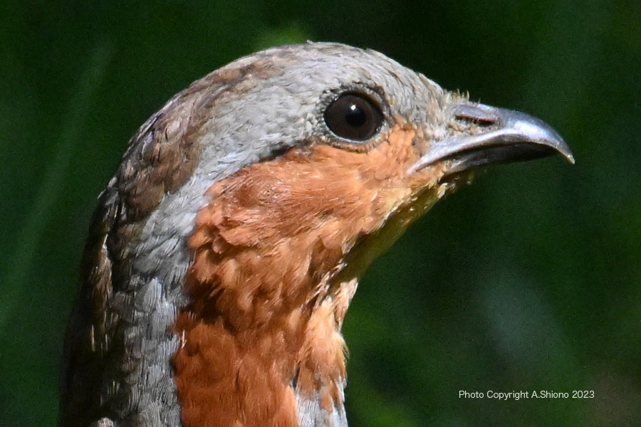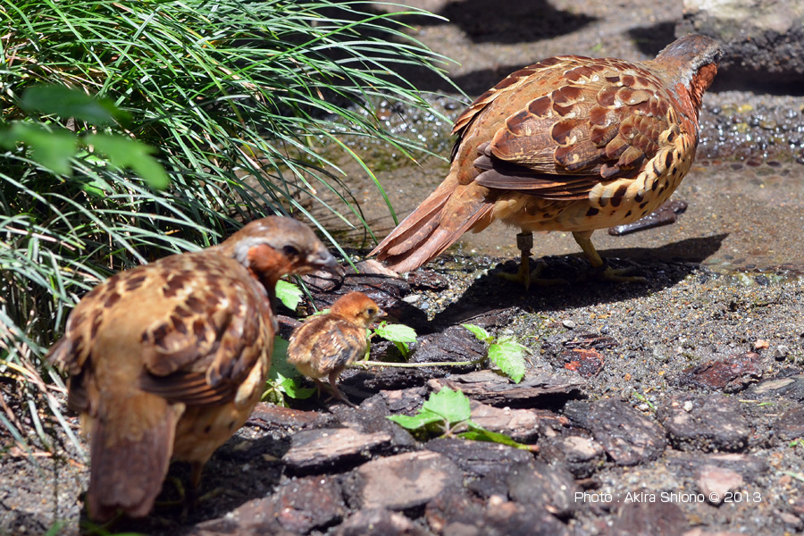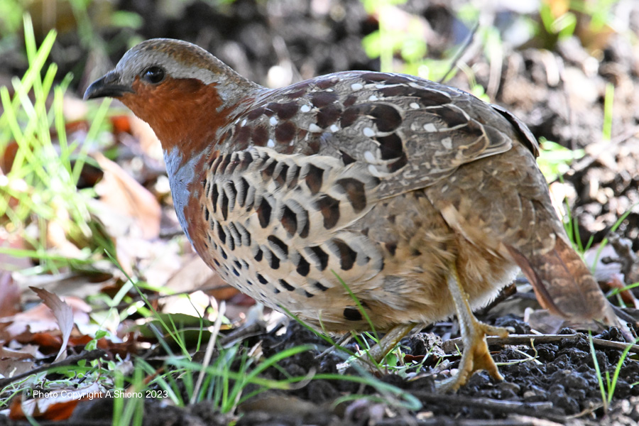 コジュケイは、キジ科ですが、キジ科のキジやヤマドリの様に長い尾羽は無く、形はウズラの様な丸っこい体をしています。全長はウズラの約20cmに比べ、約30cmと大型です。色は茶褐色で、顔から胸にかけてオレンジに近い茶褐色をしています。