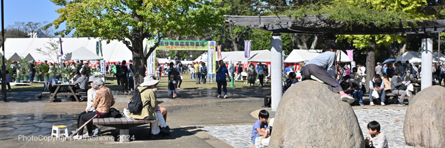 会場南東側の国分寺農業祭会場のゲートと「こくべじ」の野菜即売会。