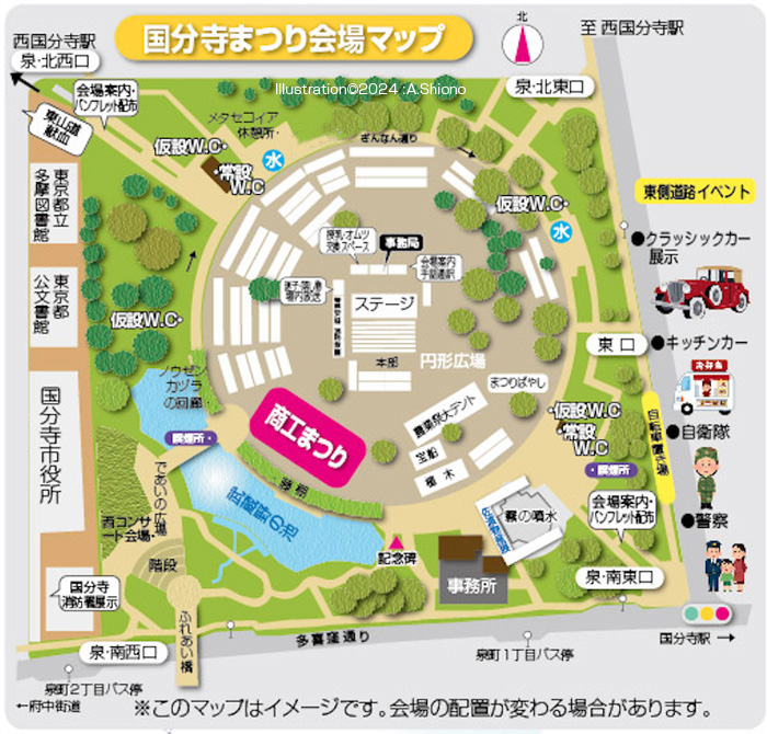 令和6年で41回目となる市内最大の“国分寺まつり”が開催されました。今回は国分寺市制60周年と新庁舎が間も無く完成ということで、11月の3日(日)と4日(祝・振休)の2日間開催となりました。模擬店は揃っていましたが、1日目は昼に開会式が行われ、後にステージでは「市制施行60周年記念ライブ」が観光大使である荒川ケンタウロスによって行われました。 翌日の4日のステージでは恒例の各市民団体による、各種ダンスなどが行われました。野外では、円形広場の周囲の道を利用して、演奏・行進、民謡流し、サンバ・阿波踊りなどの各種パレードがおこなわれました。