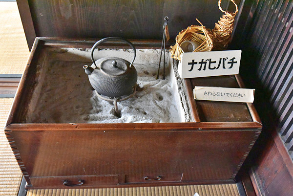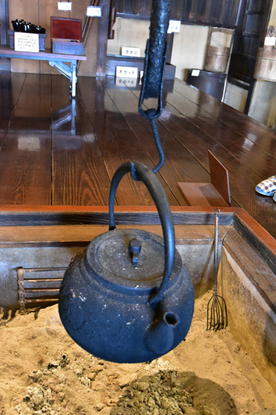 いろりは、天井から自在鍵で鉄瓶が吊られています。冬には暖房、湯沸かし、焼き物、調理など活躍。