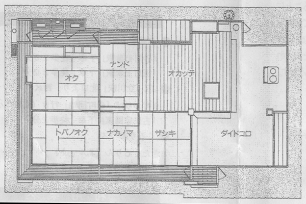 小林家は、立川市幸町4丁目37番の1にあって、江戸時代以来、旧砂川九番組に属してきたお宅です。その母屋は、砂川には数少ない六間型(土間をのぞき6部屋で構成される)で、高い技術と優れた材料が使われた「オク」の間で、床の間・違い棚・書院などの座敷飾りは、当時の武家住宅に匹敵するほどの高い格式をもっています。 民俗古民家園の母屋 トップへ 小林家の住宅復元は、平成元年5月に調査が始められ、平成5年10月17日に川越道緑地古民家園が開園しています。