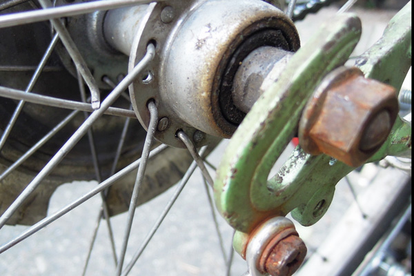 使う工具は、タイヤ交換の時に車軸のナットを緩めるために使う、15mmのスパナ・レンチ(無ければモンキーレンチ)です。 車軸まわりを取り外す ▲top
