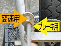 ![]() 変速レバーをハンドルに取り付け、2速に変えます。シフトワイヤーのロックナットを10mmスパナで緩めます。